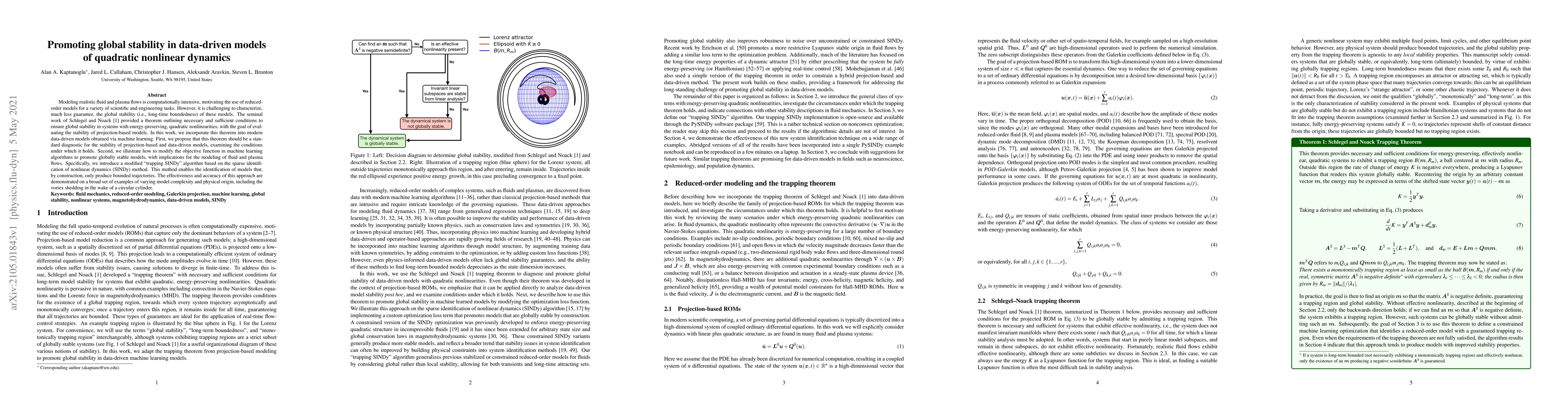 Modeling realistic fluid and plasma flows is computationally intensive, motivating the use of reduced-order models for a variety of scientific and engineering tasks. However, it is challenging to characterize, much less guarantee, the global stability (i.e., long-time boundedness) of these models. The seminal work of Schlegel and Noack (JFM, 2015) provided a theorem outlining necessary and sufficient conditions to ensure global stability in systems with energy-preserving, quadratic nonlinearities, with the goal of evaluating the stability of projection-based models. In this work, we incorporate this theorem into modern data-driven models obtained via machine learning. First, we propose that this theorem should be a standard diagnostic for the stability of projection-based and data-driven models, examining the conditions under which it holds. Second, we illustrate how to modify the objective function in machine learning algorithms to promote globally stable models, with implications for the modeling of fluid and plasma flows. Specifically, we introduce a modified "trapping SINDy" algorithm based on the sparse identification of nonlinear dynamics (SINDy) method. This method enables the identification of models that, by construction, only produce bounded trajectories. The effectiveness and accuracy of this approach are demonstrated on a broad set of examples of varying model complexity and physical origin, including the vortex shedding in the wake of a circular cylinder.