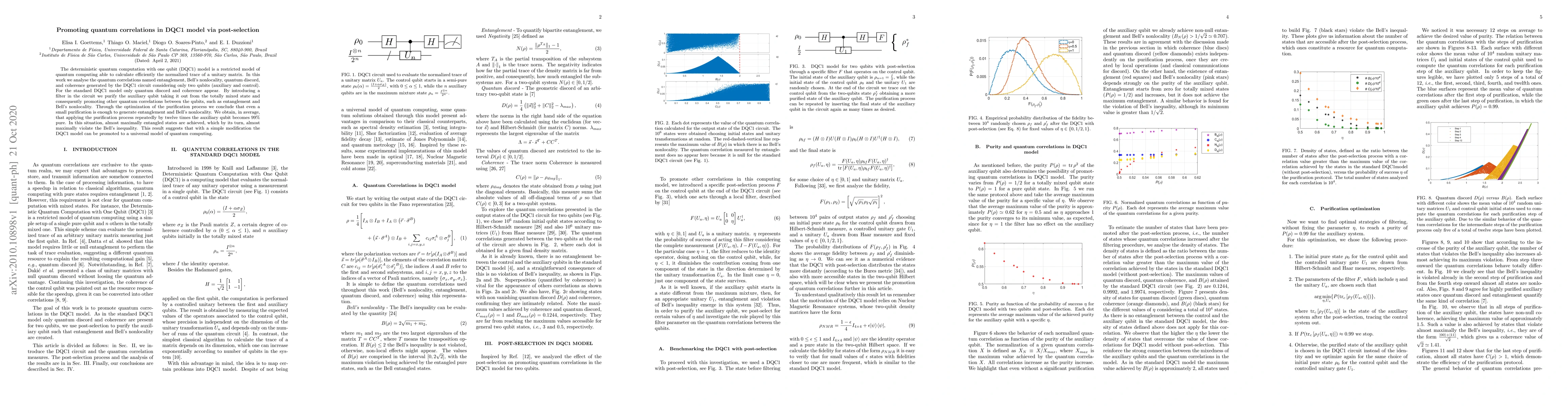 This paper explores the enhancement of quantum correlations in the DQC1 model by post-selection and purification of the auxiliary qubit. Through optimization, it demonstrates that even minor purification can generate significant entanglement and Bell's nonlocality, suggesting that DQC1 can be upgraded to a universal quantum computing model.