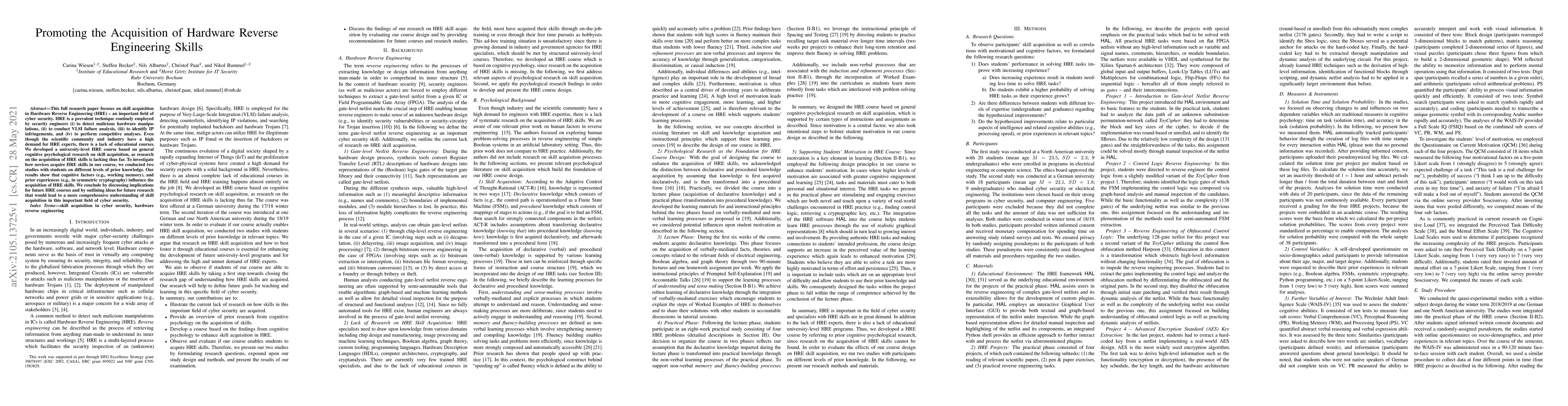 This full research paper focuses on skill acquisition in Hardware Reverse Engineering (HRE) - an important field of cyber security. HRE is a prevalent technique routinely employed by security engineers (i) to detect malicious hardware manipulations, (ii) to conduct VLSI failure analysis, (iii) to identify IP infringements, and (iv) to perform competitive analyses. Even though the scientific community and industry have a high demand for HRE experts, there is a lack of educational courses. We developed a university-level HRE course based on general cognitive psychological research on skill acquisition, as research on the acquisition of HRE skills is lacking thus far. To investigate how novices acquire HRE skills in our course, we conducted two studies with students on different levels of prior knowledge. Our results show that cognitive factors (e.g., working memory), and prior experiences (e.g., in symmetric cryptography) influence the acquisition of HRE skills. We conclude by discussing implications for future HRE courses and by outlining ideas for future research that would lead to a more comprehensive understanding of skill acquisition in this important field of cyber security.