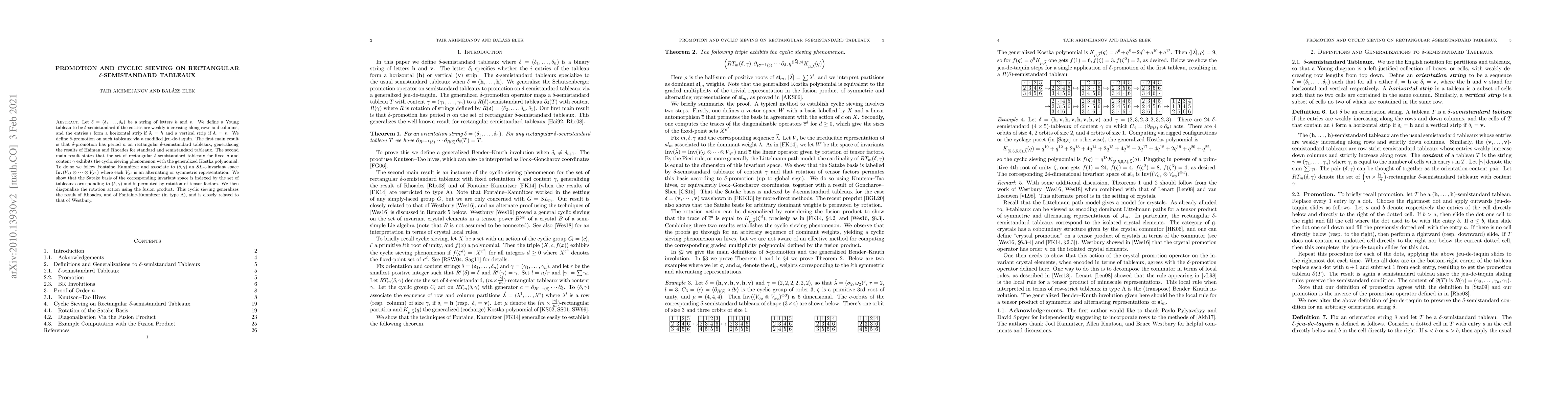 The paper explores $\delta$-semistandard Young tableaux with $\delta$-promotion, proving that $\delta$-promotion has a period of $n$ on rectangular $\delta$-semistandard tableaux. It also demonstrates the cyclic sieving phenomenon in these tableaux using the generalized Kostka polynomial, relating this to $SL_m$-invariant spaces and the fusion product.