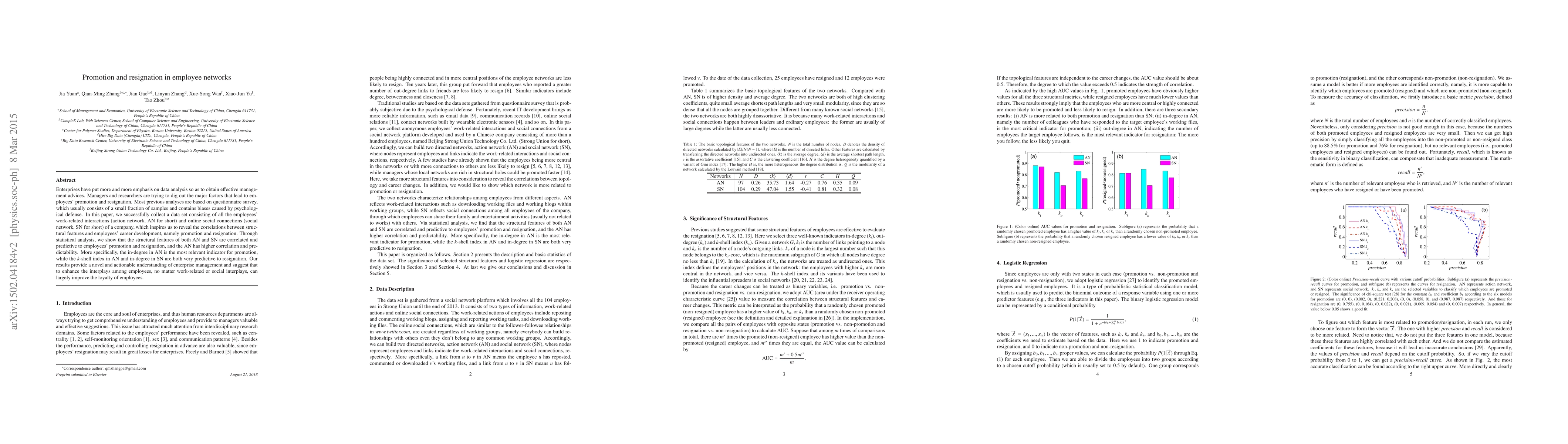 Enterprises have put more and more emphasis on data analysis so as to obtain effective management advices. Managers and researchers are trying to dig out the major factors that lead to employees' promotion and resignation. Most previous analyses were based on questionnaire survey, which usually consists of a small fraction of samples and contains biases caused by psychological defense. In this paper, we successfully collect a data set consisting of all the employees' work-related interactions (action network, AN for short) and online social connections (social network, SN for short) of a company, which inspires us to reveal the correlations between structural features and employees' career development, namely promotion and resignation. Through statistical analysis and prediction, we show that the structural features of both AN and SN are correlated and predictive to employees' promotion and resignation, and the AN has higher correlation and predictability. More specifically, the in-degree in AN is the most relevant indicator for promotion; while the k-shell index in AN and in-degree in SN are both very predictive to resignation. Our results provide a novel and actionable understanding of enterprise management and suggest that to enhance the interplays among employees, no matter work-related or social interplays, can largely improve the loyalty of employees.