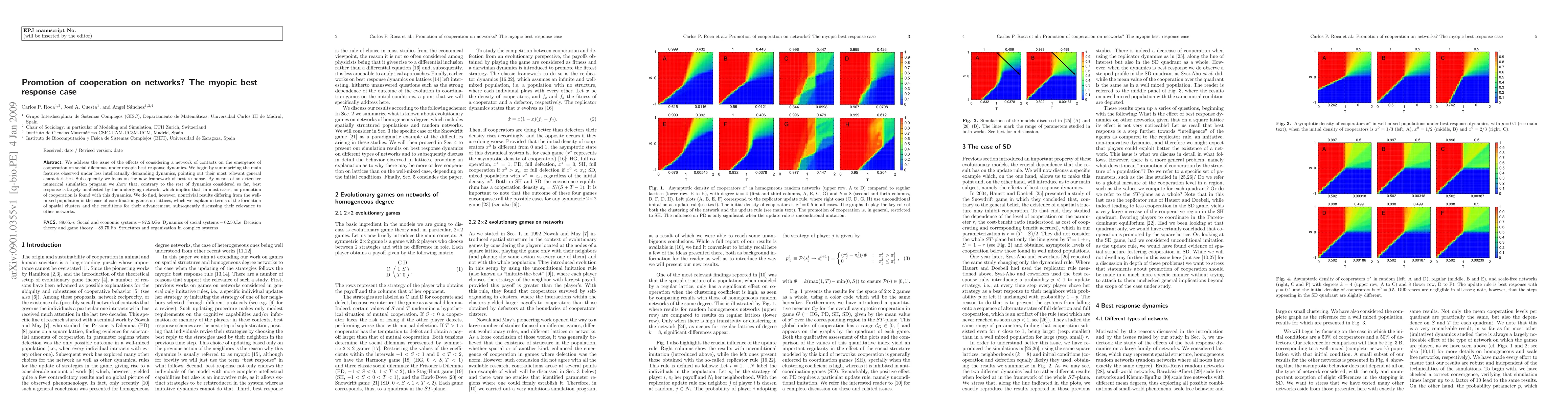 We address the issue of the effects of considering a network of contacts on the emergence of cooperation on social dilemmas under myopic best response dynamics. We begin by summarizing the main features observed under less intellectually demanding dynamics, pointing out their most relevant general characteristics. Subsequently we focus on the new framework of best response. By means of an extensive numerical simulation program we show that, contrary to the rest of dynamics considered so far, best response is largely unaffected by the underlying network, which implies that, in most cases, no promotion of cooperation is found with this dynamics. We do find, however, nontrivial results differing from the well-mixed population in the case of coordination games on lattices, which we explain in terms of the formation of spatial clusters and the conditions for their advancement, subsequently discussing their relevance to other networks.