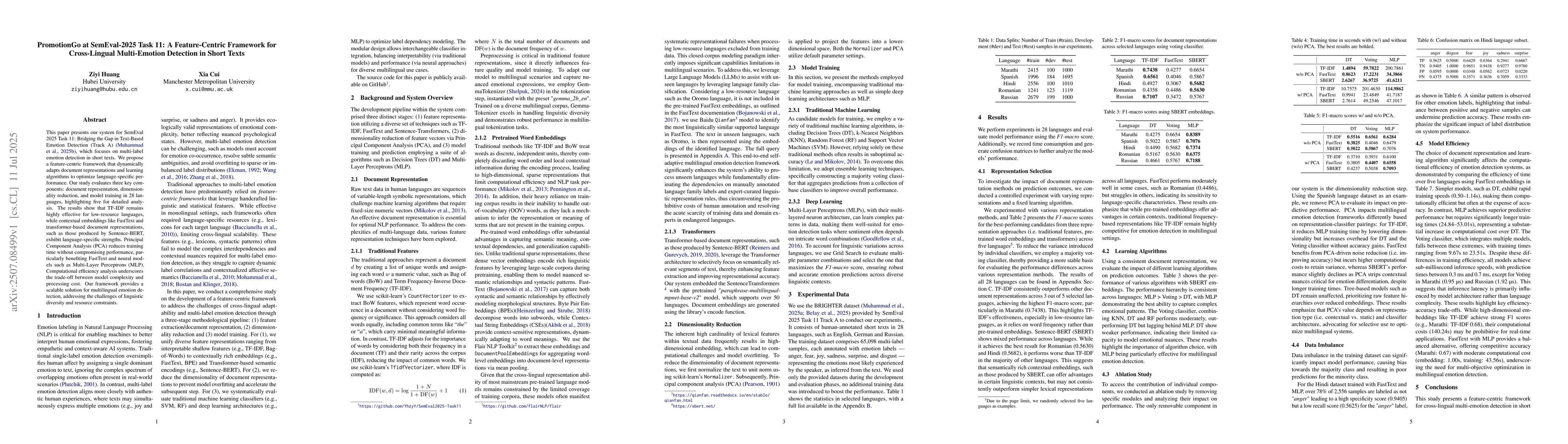 This paper presents our system for SemEval 2025 Task 11: Bridging the Gap in Text-Based Emotion Detection (Track A), which focuses on multi-label emotion detection in short texts. We propose a feature-centric framework that dynamically adapts document representations and learning algorithms to optimize language-specific performance. Our study evaluates three key components: document representation, dimensionality reduction, and model training in 28 languages, highlighting five for detailed analysis. The results show that TF-IDF remains highly effective for low-resource languages, while contextual embeddings like FastText and transformer-based document representations, such as those produced by Sentence-BERT, exhibit language-specific strengths. Principal Component Analysis (PCA) reduces training time without compromising performance, particularly benefiting FastText and neural models such as Multi-Layer Perceptrons (MLP). Computational efficiency analysis underscores the trade-off between model complexity and processing cost. Our framework provides a scalable solution for multilingual emotion detection, addressing the challenges of linguistic diversity and resource constraints.