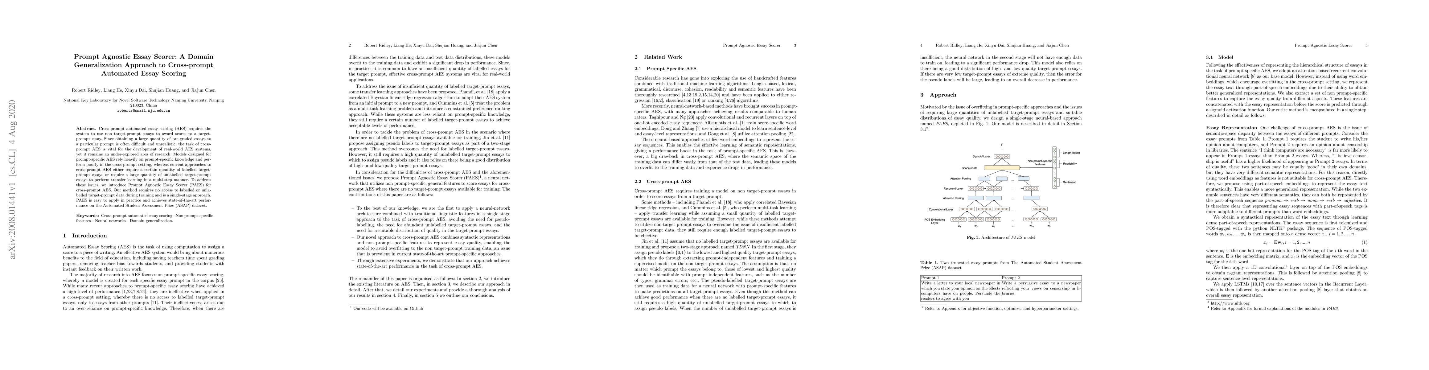 The paper introduces Prompt Agnostic Essay Scorer (PAES), a domain generalization approach for cross-prompt automated essay scoring that requires no labelled or unlabelled target-prompt data during training, achieving state-of-the-art performance on the ASAP dataset. PAES addresses the challenges of prompt-specific models and multi-step transfer learning methods in cross-prompt AES.