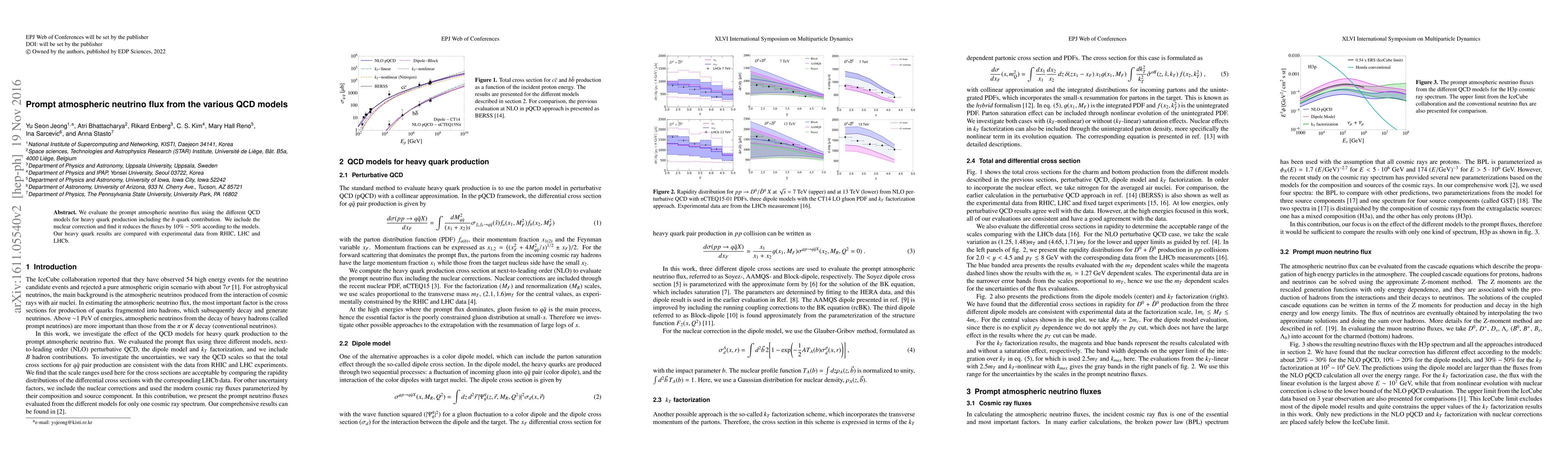 This study evaluates the prompt atmospheric neutrino flux through various QCD models for heavy quark production, including $b$ quark contributions, and finds nuclear corrections reduce these fluxes by $10\% - 50\%$. The results are compared with experimental data from RHIC, LHC, and LHCb.