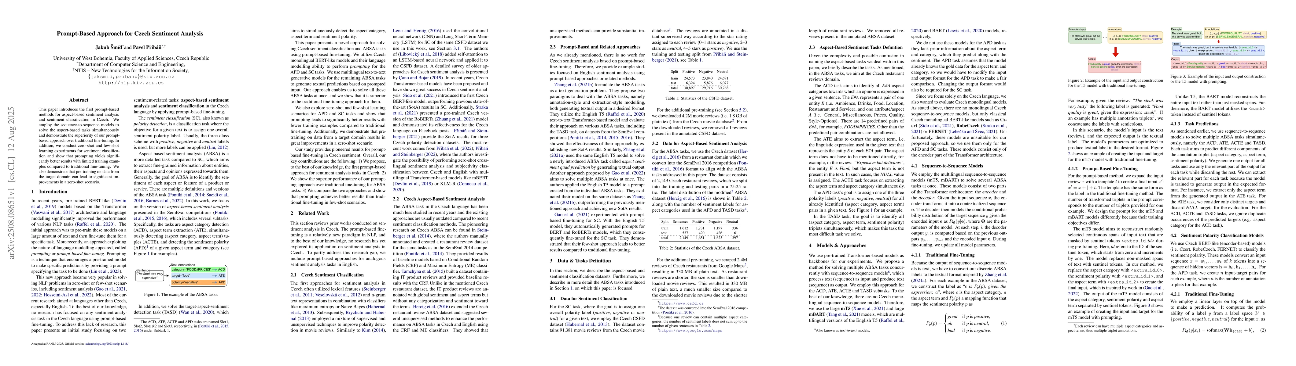 This paper introduces the first prompt-based methods for aspect-based sentiment analysis and sentiment classification in Czech. We employ the sequence-to-sequence models to solve the aspect-based tasks simultaneously and demonstrate the superiority of our prompt-based approach over traditional fine-tuning. In addition, we conduct zero-shot and few-shot learning experiments for sentiment classification and show that prompting yields significantly better results with limited training examples compared to traditional fine-tuning. We also demonstrate that pre-training on data from the target domain can lead to significant improvements in a zero-shot scenario.