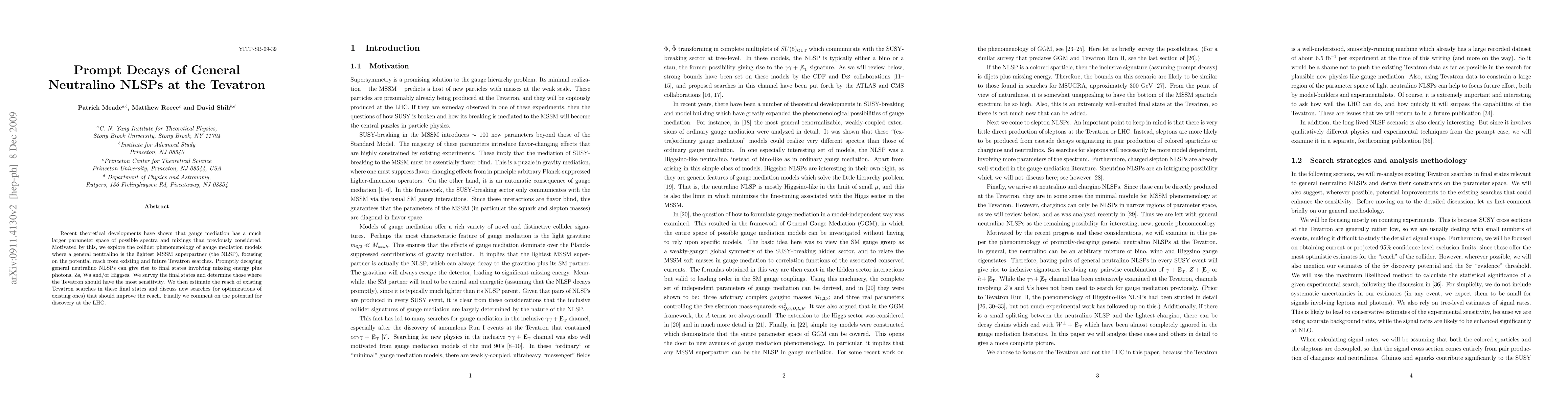 This paper investigates the collider phenomenology of gauge mediation models with a general neutralino as the next-to-lightest superpartner (NLSP), focusing on its prompt decay signatures at the Tevatron. It identifies final states with missing energy and additional photons, Zs, Ws, or Higgses that offer the best sensitivity and evaluates the potential reach of existing and future Tevatron searches.
