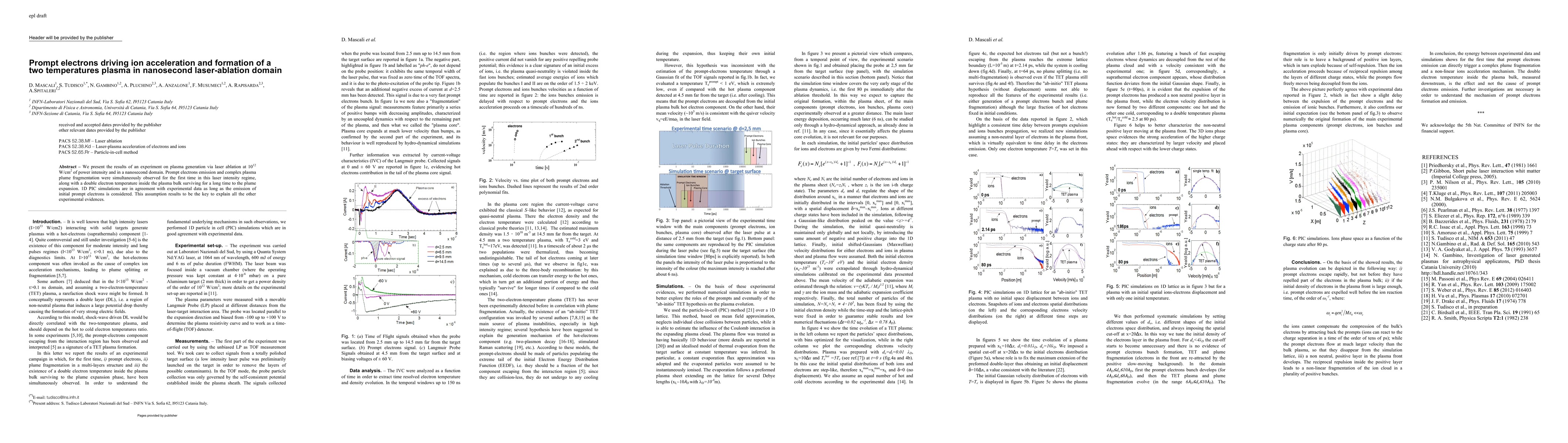 This research investigates plasma generation through nanosecond laser-ablation at 10^12 W/cm^2, revealing prompt electron emission and complex plasma plume fragmentation. Experimental findings show a persistent double electron temperature in the plasma, corroborated by 1D PIC simulations that attribute the phenomena to the emission of initial prompt electrons.