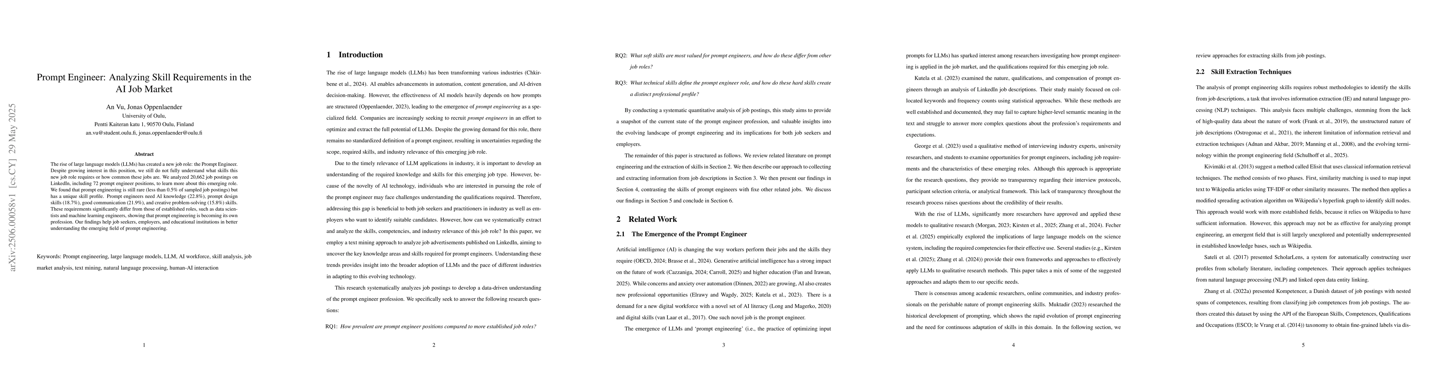 Prompt engineering is a rare job role that requires unique skills such as AI knowledge, prompt design skills, good communication, and creative problem-solving. A study of 20,662 job postings found less than 0.5% of sampled positions were for prompt engineers, highlighting its emergence as a distinct profession.