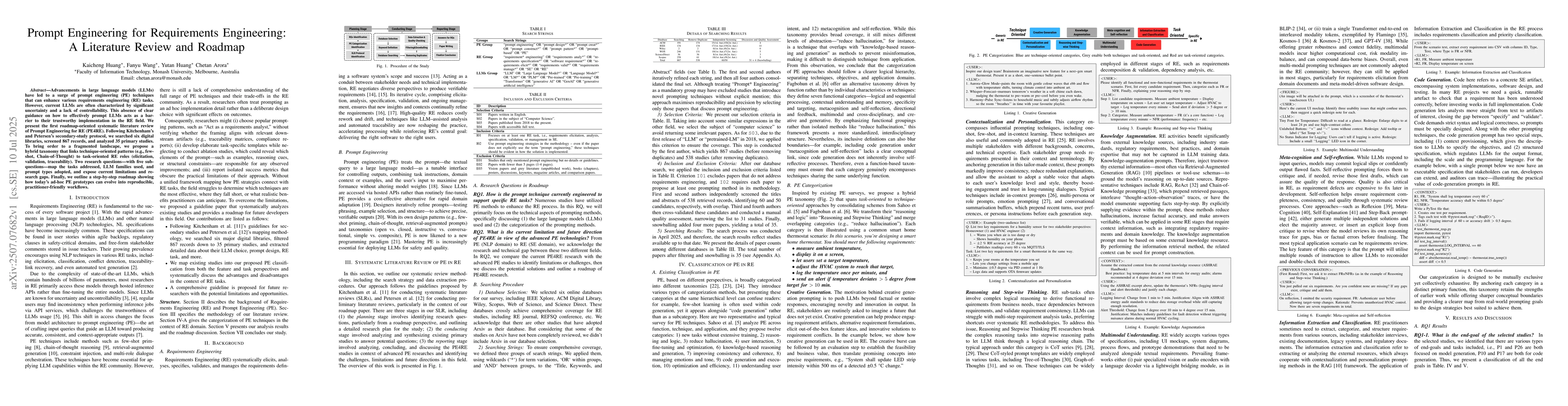 This study conducted a systematic literature review (SLR) following Kitchenham and Petersen's protocol, searching six digital libraries, screening 867 records, and analyzing 35 primary studies on Prompt Engineering for Requirements Engineering (PE4RE).