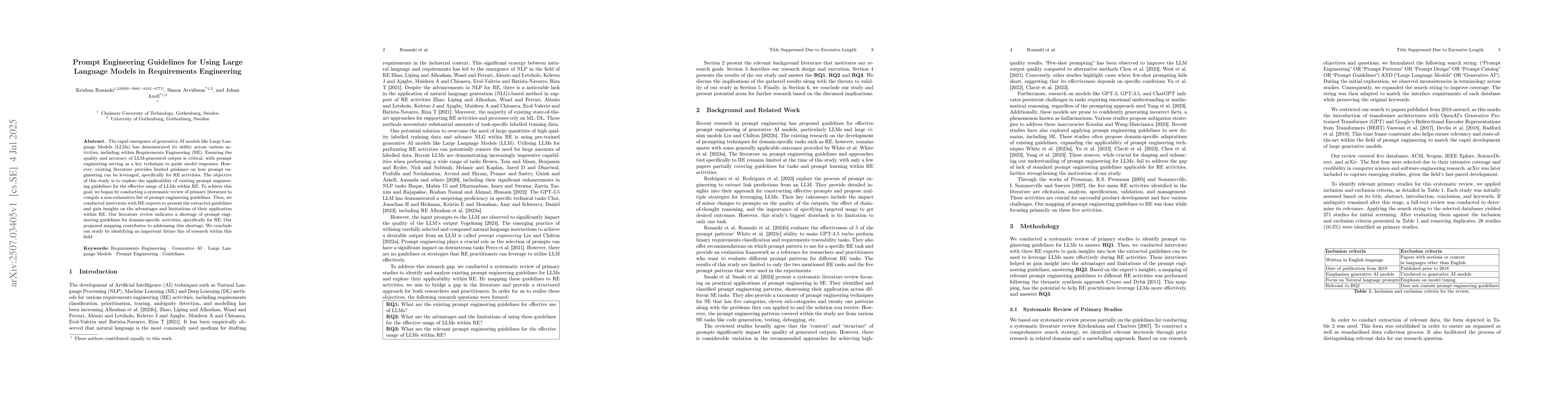 The rapid emergence of generative AI models like Large Language Models (LLMs) has demonstrated its utility across various activities, including within Requirements Engineering (RE). Ensuring the quality and accuracy of LLM-generated output is critical, with prompt engineering serving as a key technique to guide model responses. However, existing literature provides limited guidance on how prompt engineering can be leveraged, specifically for RE activities. The objective of this study is to explore the applicability of existing prompt engineering guidelines for the effective usage of LLMs within RE. To achieve this goal, we began by conducting a systematic review of primary literature to compile a non-exhaustive list of prompt engineering guidelines. Then, we conducted interviews with RE experts to present the extracted guidelines and gain insights on the advantages and limitations of their application within RE. Our literature review indicates a shortage of prompt engineering guidelines for domain-specific activities, specifically for RE. Our proposed mapping contributes to addressing this shortage. We conclude our study by identifying an important future line of research within this field.