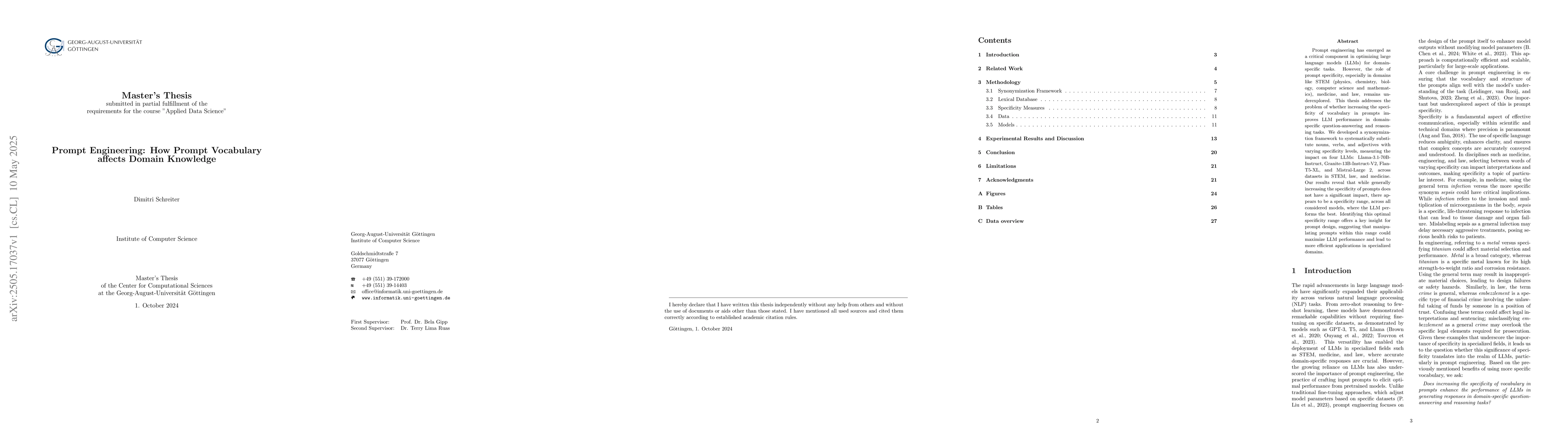 Prompt engineering has emerged as a critical component in optimizing large language models (LLMs) for domain-specific tasks. However, the role of prompt specificity, especially in domains like STEM (physics, chemistry, biology, computer science and mathematics), medicine, and law, remains underexplored. This thesis addresses the problem of whether increasing the specificity of vocabulary in prompts improves LLM performance in domain-specific question-answering and reasoning tasks. We developed a synonymization framework to systematically substitute nouns, verbs, and adjectives with varying specificity levels, measuring the impact on four LLMs: Llama-3.1-70B-Instruct, Granite-13B-Instruct-V2, Flan-T5-XL, and Mistral-Large 2, across datasets in STEM, law, and medicine. Our results reveal that while generally increasing the specificity of prompts does not have a significant impact, there appears to be a specificity range, across all considered models, where the LLM performs the best. Identifying this optimal specificity range offers a key insight for prompt design, suggesting that manipulating prompts within this range could maximize LLM performance and lead to more efficient applications in specialized domains.