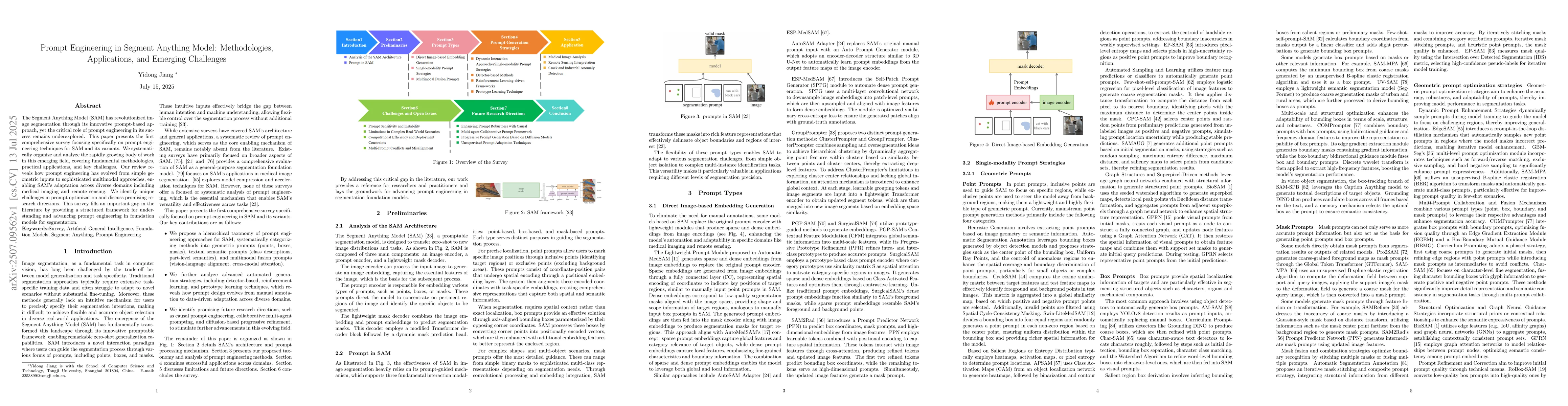 The Segment Anything Model (SAM) has revolutionized image segmentation through its innovative prompt-based approach, yet the critical role of prompt engineering in its success remains underexplored. This paper presents the first comprehensive survey focusing specifically on prompt engineering techniques for SAM and its variants. We systematically organize and analyze the rapidly growing body of work in this emerging field, covering fundamental methodologies, practical applications, and key challenges. Our review reveals how prompt engineering has evolved from simple geometric inputs to sophisticated multimodal approaches, enabling SAM's adaptation across diverse domains including medical imaging and remote sensing. We identify unique challenges in prompt optimization and discuss promising research directions. This survey fills an important gap in the literature by providing a structured framework for understanding and advancing prompt engineering in foundation models for segmentation.