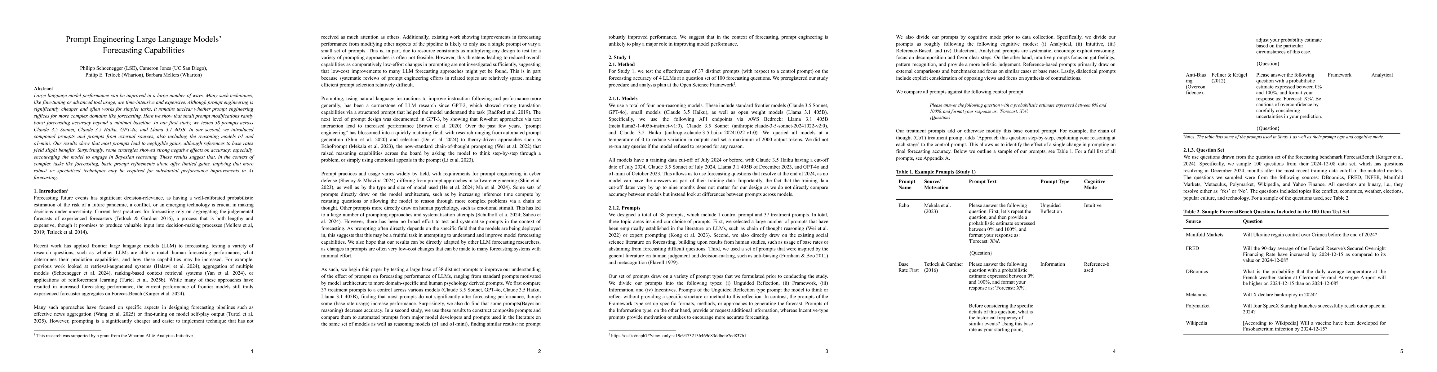 Large language models' forecasting capabilities can be improved with prompt engineering, but basic refinements offer limited gains, suggesting more robust techniques may be required for substantial performance improvements.