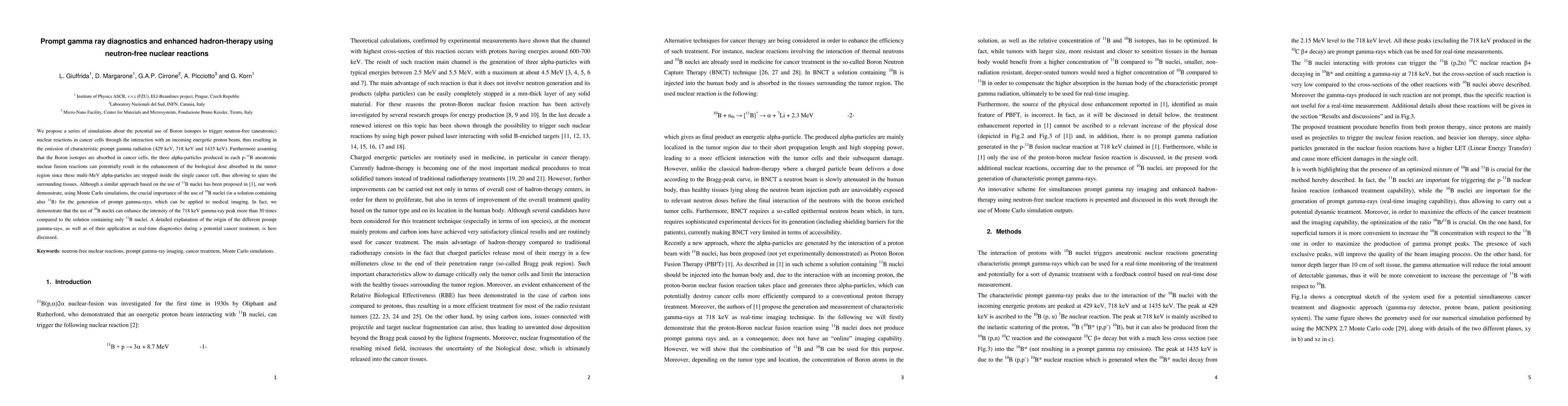 We propose a series of simulations about the potential use of Boron isotopes to trigger neutron-free (aneutronic) nuclear reactions in cancer cells through the interaction with an incoming energetic proton beam, thus resulting in the emission of characteristic prompt gamma radiation (429 keV, 718 keV and 1435 keV). Furthermore assuming that the Boron isotopes are absorbed in cancer cells, the three alpha-particles produced in each p-11B aneutronic nuclear fusion reactions can potentially result in the enhancement of the biological dose absorbed in the tumor region since these multi-MeV alpha-particles are stopped inside the single cancer cell, thus allowing to spare the surrounding tissues. Although a similar approach based on the use of 11B nuclei has been proposed in [1], our work demonstrate, using Monte Carlo simulations, the crucial importance of the use of 10B nuclei (in a solution containing also 11B) for the generation of prompt gamma-rays, which can be applied to medical imaging. In fact, we demonstrate that the use of 10B nuclei can enhance the intensity of the 718 keV gamma-ray peak more than 30 times compared to the solution containing only 11B nuclei. A detailed explanation of the origin of the different prompt gamma-rays, as well as of their application as real-time diagnostics during a potential cancer treatment, is here discussed.