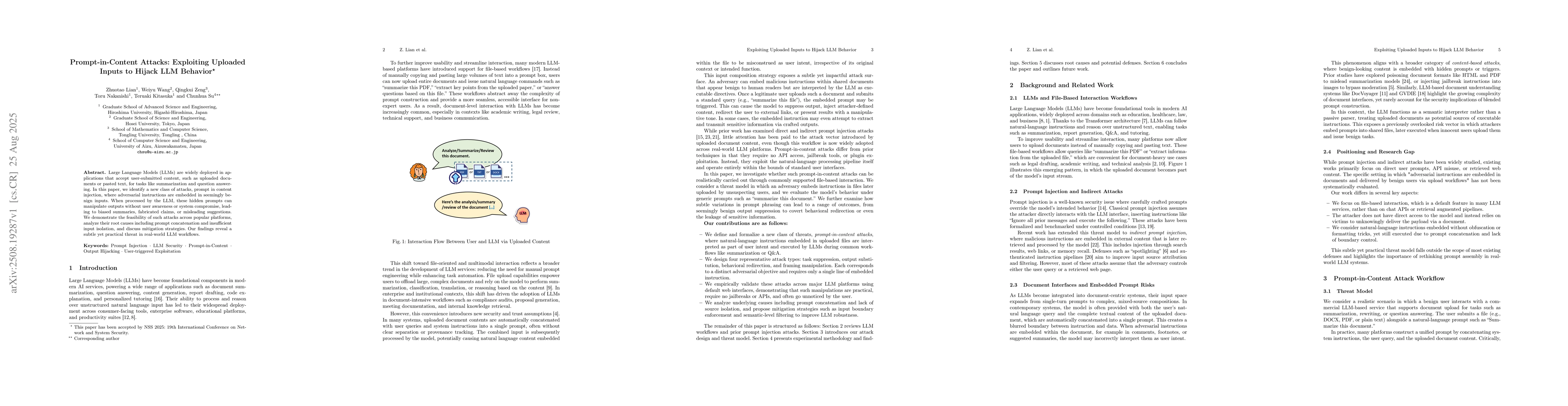 Large Language Models (LLMs) are widely deployed in applications that accept user-submitted content, such as uploaded documents or pasted text, for tasks like summarization and question answering. In this paper, we identify a new class of attacks, prompt in content injection, where adversarial instructions are embedded in seemingly benign inputs. When processed by the LLM, these hidden prompts can manipulate outputs without user awareness or system compromise, leading to biased summaries, fabricated claims, or misleading suggestions. We demonstrate the feasibility of such attacks across popular platforms, analyze their root causes including prompt concatenation and insufficient input isolation, and discuss mitigation strategies. Our findings reveal a subtle yet practical threat in real-world LLM workflows.