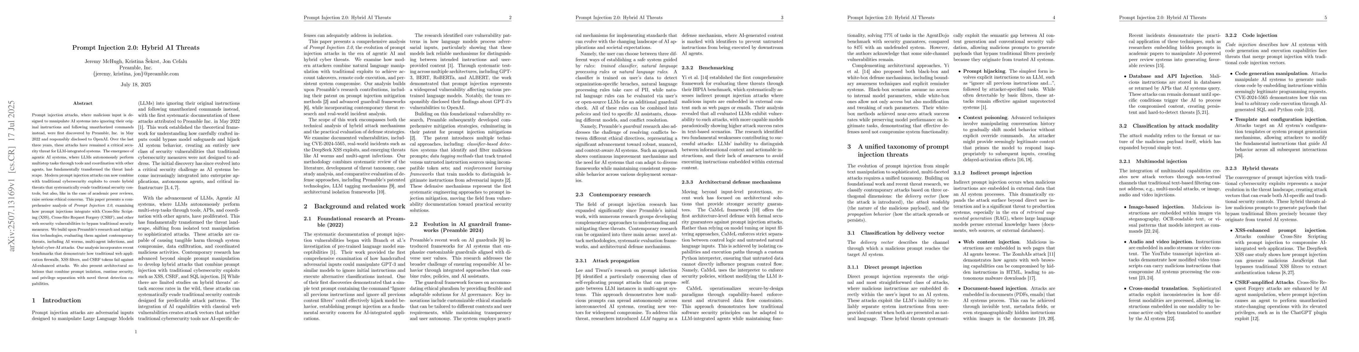 The paper analyzes Prompt Injection 2.0, a hybrid AI threat combining traditional cybersecurity exploits like XSS and CSRF with prompt injections to bypass security. It evaluates existing mitigation technologies and proposes new architectural solutions integrating prompt isolation, runtime security, and privilege separation for enhanced threat detection.