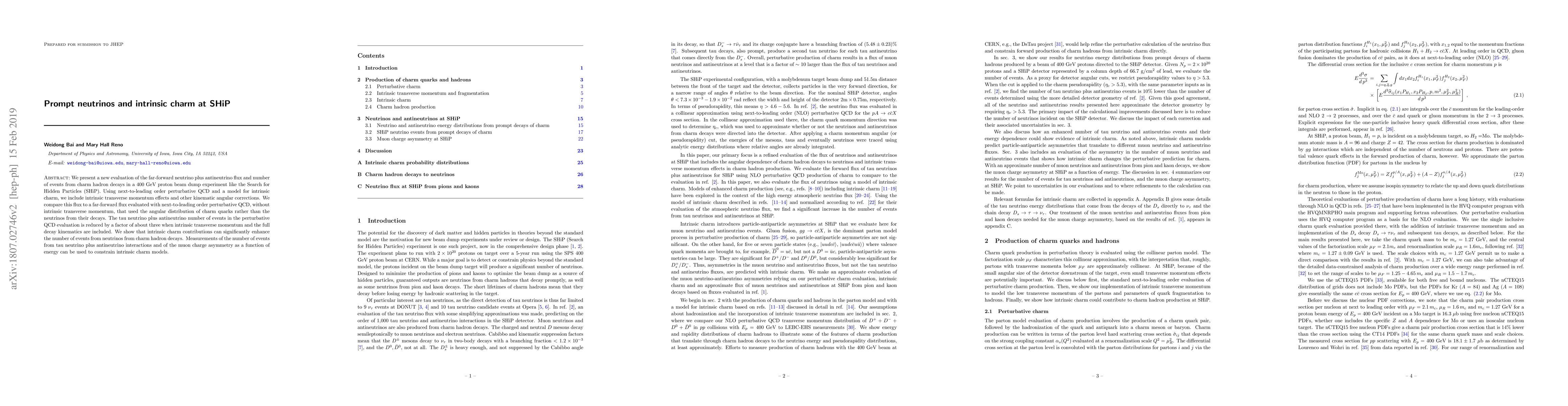 We present a new evaluation of the far-forward neutrino plus antineutrino flux and number of events from charm hadron decays in a 400 GeV proton beam dump experiment like the Search for Hidden Particles (SHiP). Using next-to-leading order perturbative QCD and a model for intrinsic charm, we include intrinsic transverse momentum effects and other kinematic angular corrections. We compare this flux to a far-forward flux evaluated with next-to-leading order perturbative QCD, without intrinsic transverse momentum, that used the angular distribution of charm quarks rather than the neutrinos from their decays. The tau neutrino plus antineutrino number of events in the perturbative QCD evaluation is reduced by a factor of about three when intrinsic transverse momentum and the full decay kinematics are included. We show that intrinsic charm contributions can significantly enhance the number of events from neutrinos from charm hadron decays. Measurements of the number of events from tau neutrino plus antineutrino interactions and of the muon charge asymmetry as a function of energy can be used to constrain intrinsic charm models.