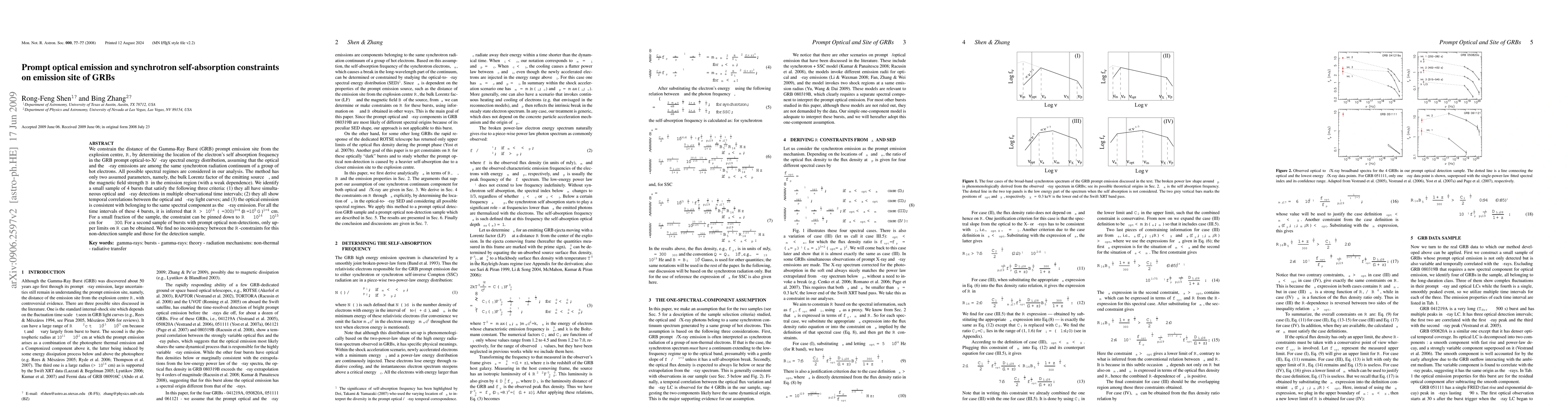 This research determines the distance of Gamma-Ray Burst (GRB) prompt emission sites from the explosion center using optical and gamma-ray spectral analysis. By assuming these emissions are from the same synchrotron radiation, the method identifies 4 GRBs with simultaneous optical and gamma-ray detections, temporal correlations, and consistent spectral components. Results show R ≥ 10^14 cm for these bursts, with some constrained closer to 10^14 - 10^15 cm for specific Γ and B values. Upper limits on R are also found for bursts without optical detections, revealing no inconsistencies between detection and non-detection samples.