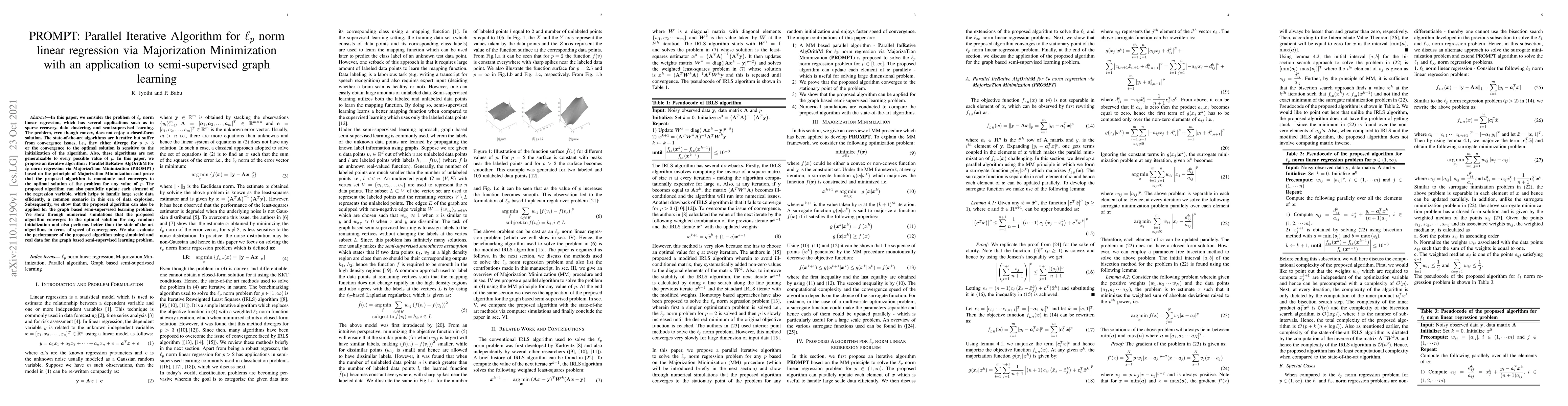 This paper proposes a novel iterative algorithm, PROMPT, for $\ell_{p}$ norm linear regression using Majorization Minimization, which is shown to converge to the optimal solution for any $p$ value and is parallelizable for large-scale data. The algorithm also extends to semi-supervised graph learning, outperforming existing methods in convergence speed.