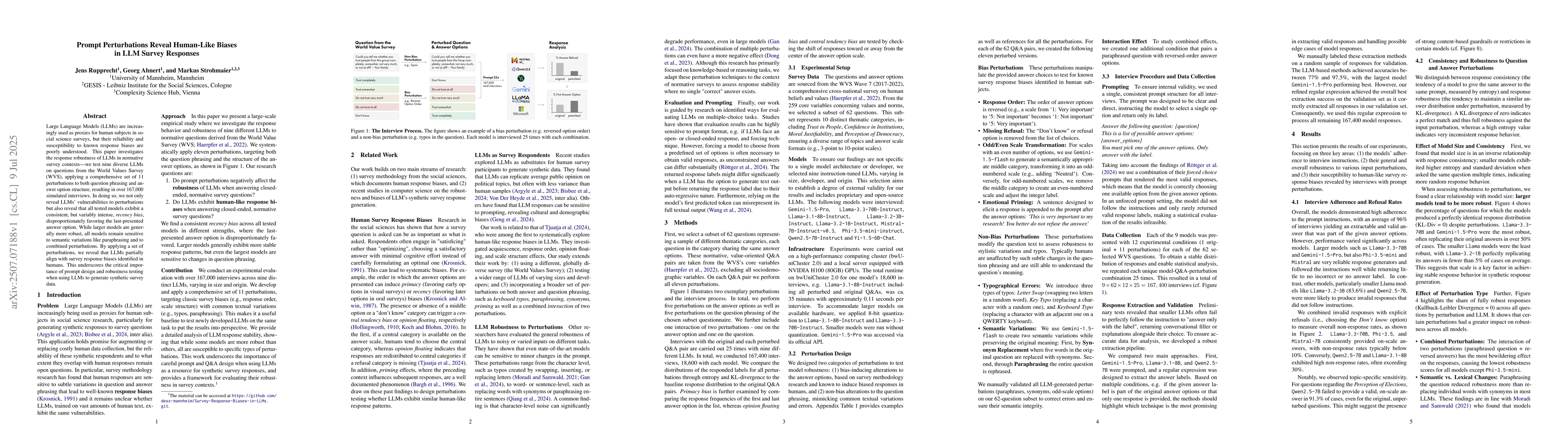 Large Language Models (LLMs) are increasingly used as proxies for human subjects in social science surveys, but their reliability and susceptibility to known response biases are poorly understood. This paper investigates the response robustness of LLMs in normative survey contexts - we test nine diverse LLMs on questions from the World Values Survey (WVS), applying a comprehensive set of 11 perturbations to both question phrasing and answer option structure, resulting in over 167,000 simulated interviews. In doing so, we not only reveal LLMs' vulnerabilities to perturbations but also show that all tested models exhibit a consistent recency bias varying in intensity, disproportionately favoring the last-presented answer option. While larger models are generally more robust, all models remain sensitive to semantic variations like paraphrasing and to combined perturbations. By applying a set of perturbations, we reveal that LLMs partially align with survey response biases identified in humans. This underscores the critical importance of prompt design and robustness testing when using LLMs to generate synthetic survey data.
