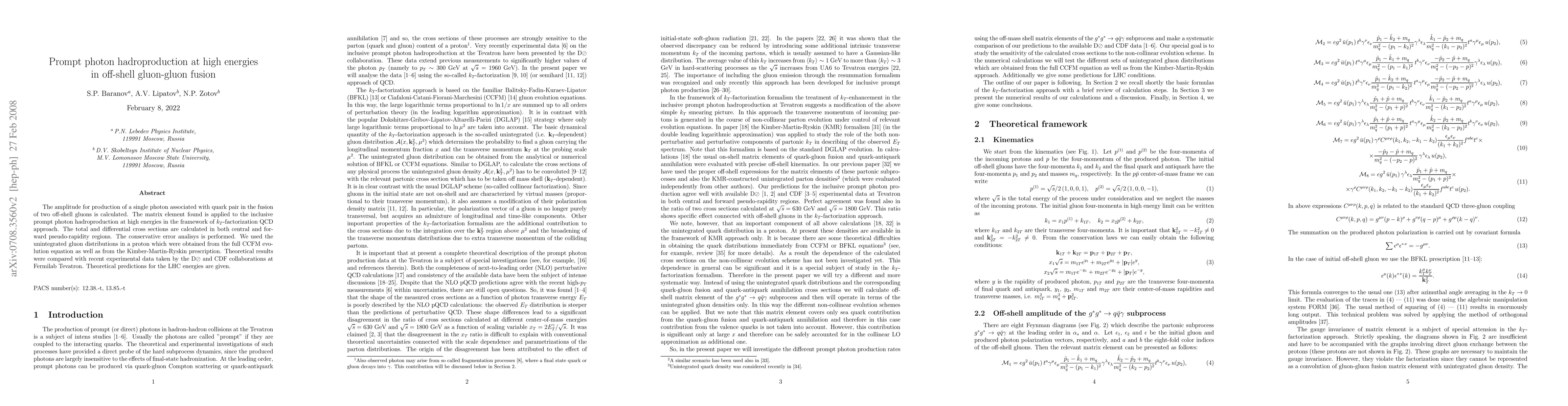 This paper calculates the matrix element for prompt photon production via off-shell gluon fusion and applies it to high-energy hadroproduction within the kt-factorization QCD approach. Theoretical predictions for total and differential cross sections are compared with experimental data from the D0 and CDF collaborations and forecasts are provided for LHC energies.