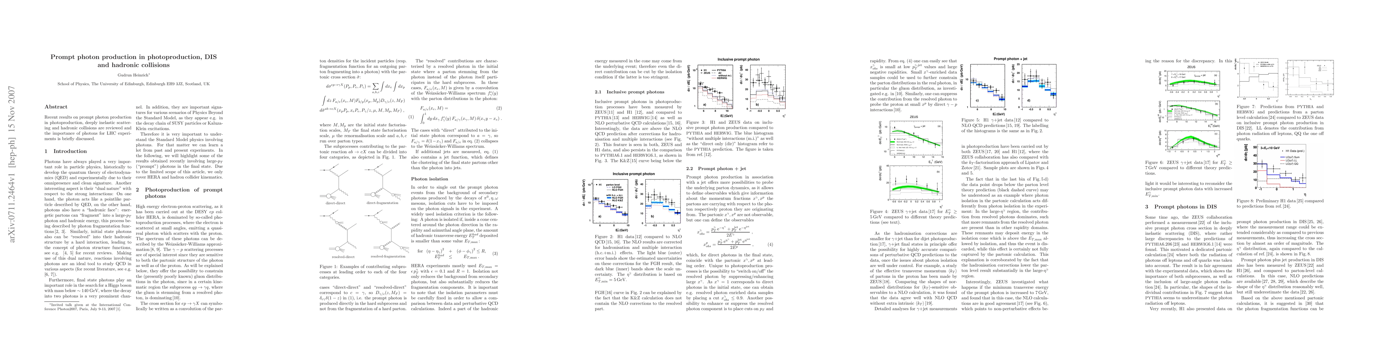 Summary: This paper reviews recent findings on prompt photon production in various high-energy processes, emphasizing their significance for Large Hadron Collider (LHC) experiments, which utilize these photons to probe fundamental interactions and test theoretical predictions.