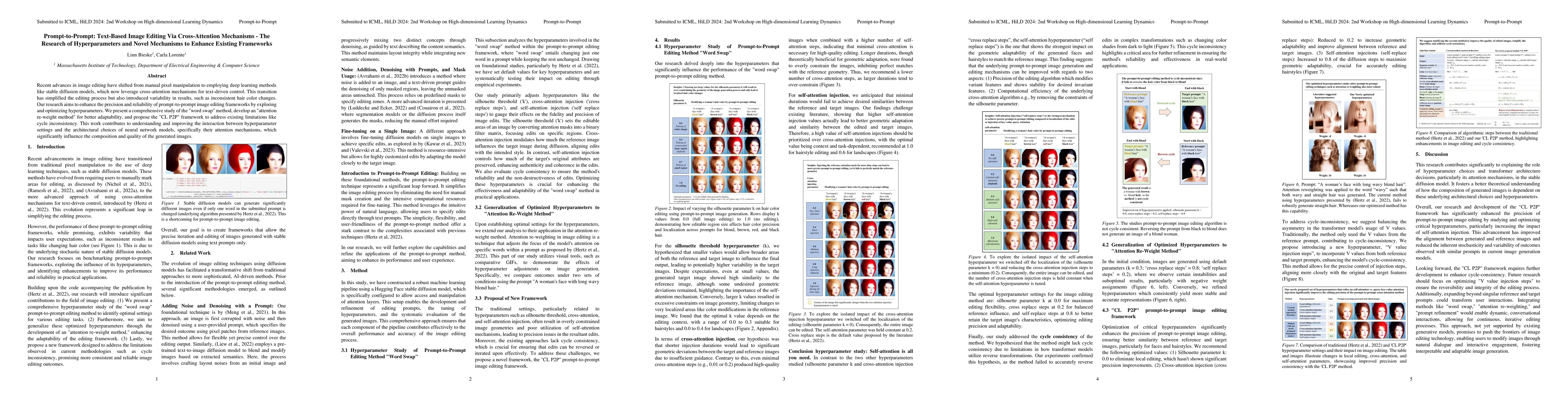 Recent advances in image editing have shifted from manual pixel manipulation to employing deep learning methods like stable diffusion models, which now leverage cross-attention mechanisms for text-driven control. This transition has simplified the editing process but also introduced variability in results, such as inconsistent hair color changes. Our research aims to enhance the precision and reliability of prompt-to-prompt image editing frameworks by exploring and optimizing hyperparameters. We present a comprehensive study of the "word swap" method, develop an "attention re-weight method" for better adaptability, and propose the "CL P2P" framework to address existing limitations like cycle inconsistency. This work contributes to understanding and improving the interaction between hyperparameter settings and the architectural choices of neural network models, specifically their attention mechanisms, which significantly influence the composition and quality of the generated images.