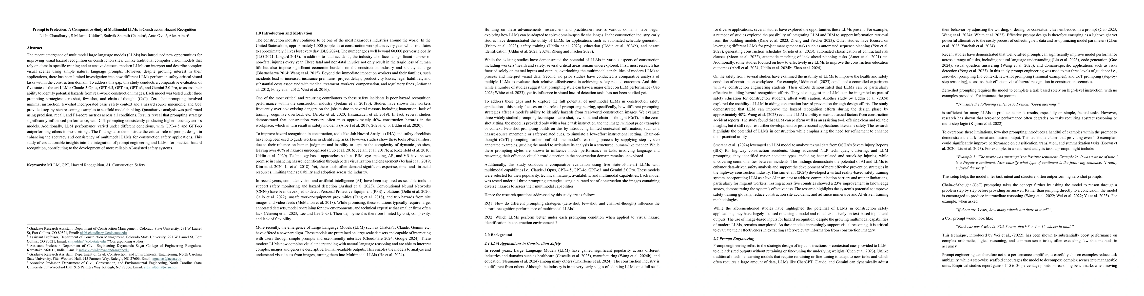 The recent emergence of multimodal large language models (LLMs) has introduced new opportunities for improving visual hazard recognition on construction sites. Unlike traditional computer vision models that rely on domain-specific training and extensive datasets, modern LLMs can interpret and describe complex visual scenes using simple natural language prompts. However, despite growing interest in their applications, there has been limited investigation into how different LLMs perform in safety-critical visual tasks within the construction domain. To address this gap, this study conducts a comparative evaluation of five state-of-the-art LLMs: Claude-3 Opus, GPT-4.5, GPT-4o, GPT-o3, and Gemini 2.0 Pro, to assess their ability to identify potential hazards from real-world construction images. Each model was tested under three prompting strategies: zero-shot, few-shot, and chain-of-thought (CoT). Zero-shot prompting involved minimal instruction, few-shot incorporated basic safety context and a hazard source mnemonic, and CoT provided step-by-step reasoning examples to scaffold model thinking. Quantitative analysis was performed using precision, recall, and F1-score metrics across all conditions. Results reveal that prompting strategy significantly influenced performance, with CoT prompting consistently producing higher accuracy across models. Additionally, LLM performance varied under different conditions, with GPT-4.5 and GPT-o3 outperforming others in most settings. The findings also demonstrate the critical role of prompt design in enhancing the accuracy and consistency of multimodal LLMs for construction safety applications. This study offers actionable insights into the integration of prompt engineering and LLMs for practical hazard recognition, contributing to the development of more reliable AI-assisted safety systems.