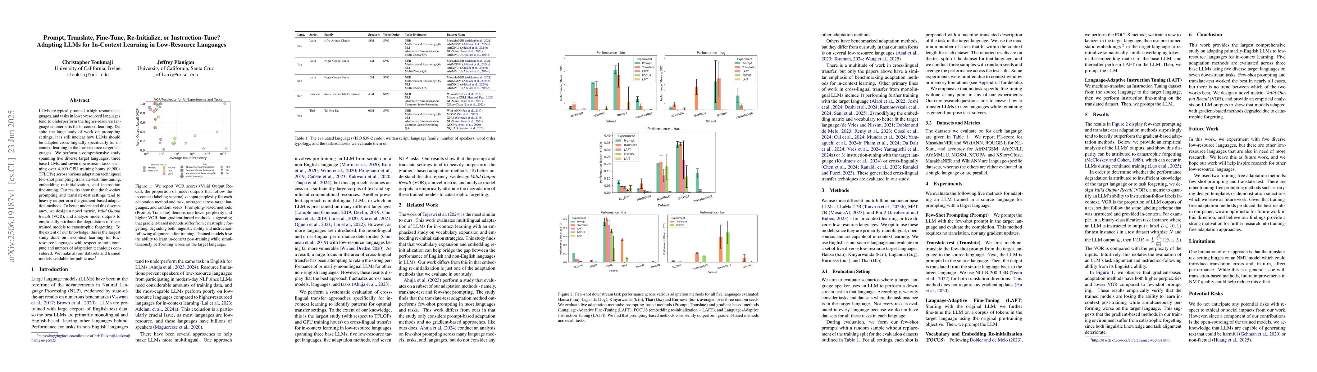 LLMs are typically trained in high-resource languages, and tasks in lower-resourced languages tend to underperform the higher-resource language counterparts for in-context learning. Despite the large body of work on prompting settings, it is still unclear how LLMs should be adapted cross-lingually specifically for in-context learning in the low-resource target languages. We perform a comprehensive study spanning five diverse target languages, three base LLMs, and seven downstream tasks spanning over 4,100 GPU training hours (9,900+ TFLOPs) across various adaptation techniques: few-shot prompting, translate-test, fine-tuning, embedding re-initialization, and instruction fine-tuning. Our results show that the few-shot prompting and translate-test settings tend to heavily outperform the gradient-based adaptation methods. To better understand this discrepancy, we design a novel metric, Valid Output Recall (VOR), and analyze model outputs to empirically attribute the degradation of these trained models to catastrophic forgetting. To the extent of our knowledge, this is the largest study done on in-context learning for low-resource languages with respect to train compute and number of adaptation techniques considered. We make all our datasets and trained models available for public use.