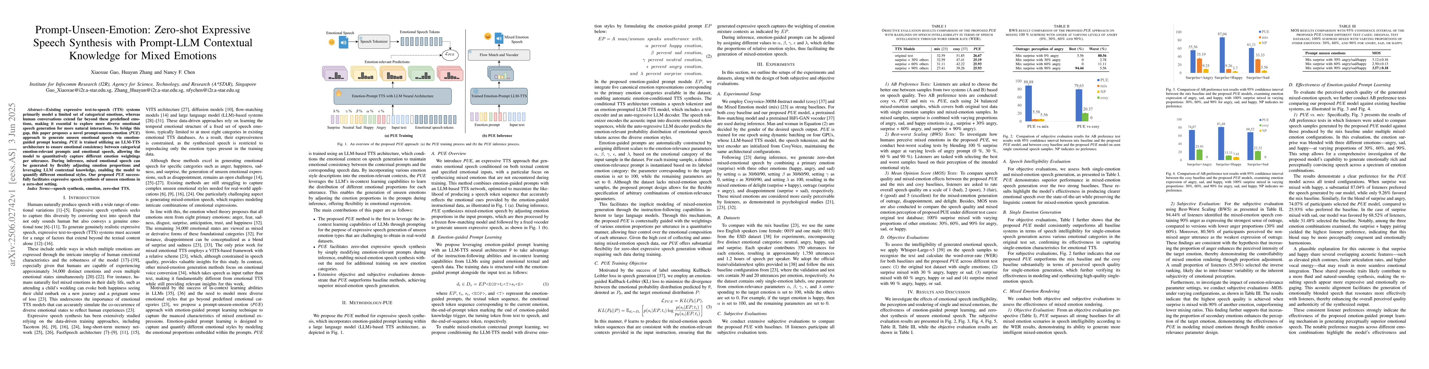 This work stands out by focusing on zero-shot emotion generation with an emphasis on mixed emotions and utilizing prompt-learning within an LLM-TTS architecture.