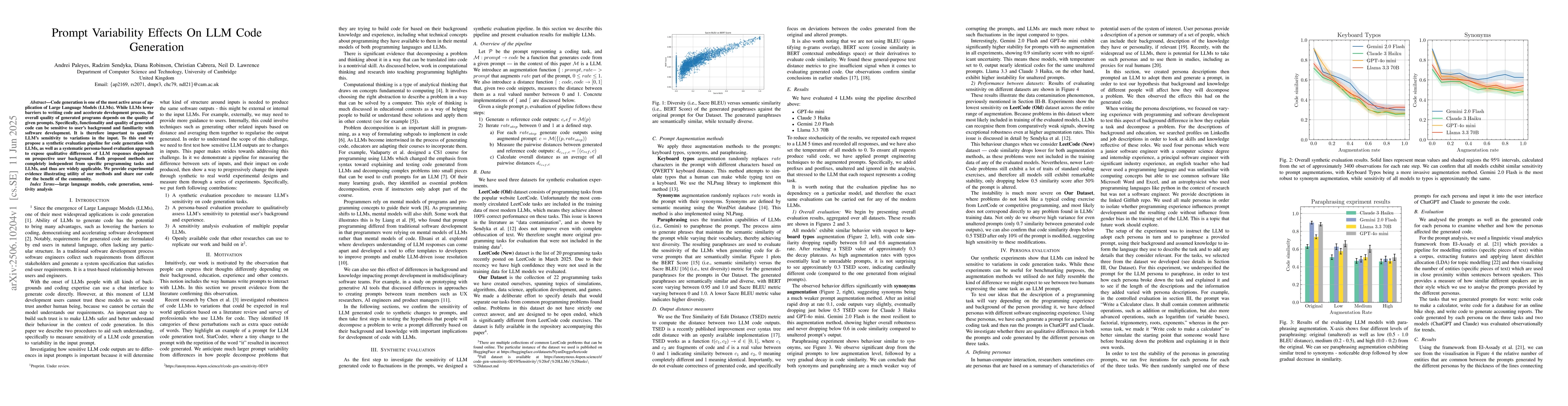 The paper introduces a synthetic evaluation procedure and a persona-based evaluation method for assessing LLM sensitivity to prompt changes in code generation.