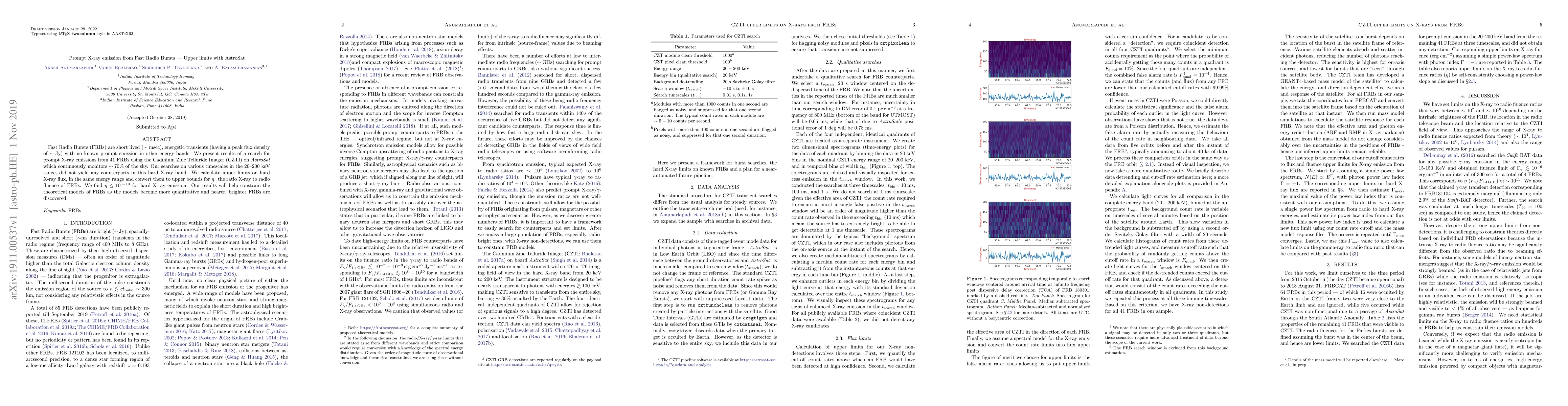 This paper reports the results of an X-ray search for prompt emissions from 41 Fast Radio Bursts using AstroSat's Cadmium Zinc Telluride Imager, finding no counterparts in the 20-200 keV range and establishing upper limits on the X-ray to radio fluence ratio, $\eta \leq 10^{8-10}$. These findings help constrain theoretical models of FRBs.