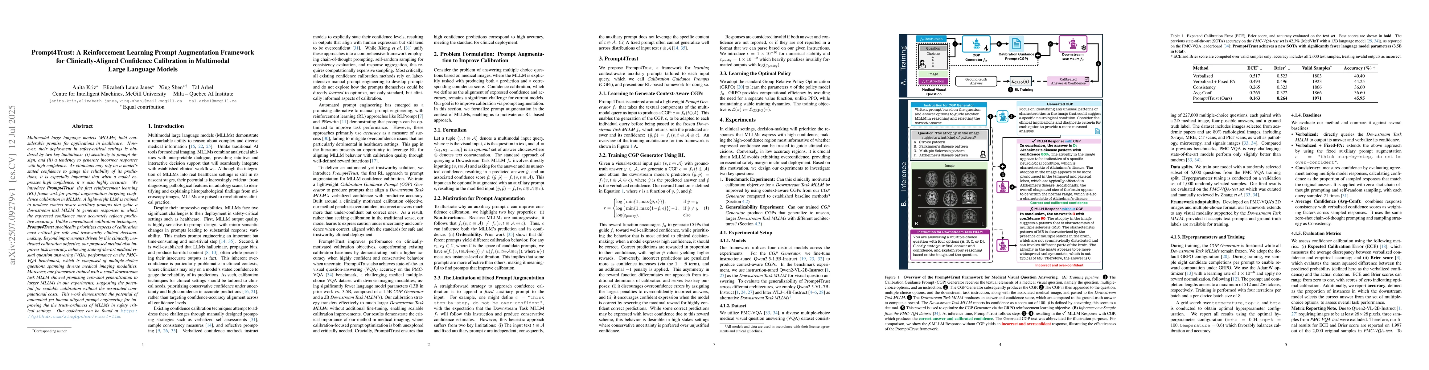 Multimodal large language models (MLLMs) hold considerable promise for applications in healthcare. However, their deployment in safety-critical settings is hindered by two key limitations: (i) sensitivity to prompt design, and (ii) a tendency to generate incorrect responses with high confidence. As clinicians may rely on a model's stated confidence to gauge the reliability of its predictions, it is especially important that when a model expresses high confidence, it is also highly accurate. We introduce Prompt4Trust, the first reinforcement learning (RL) framework for prompt augmentation targeting confidence calibration in MLLMs. A lightweight LLM is trained to produce context-aware auxiliary prompts that guide a downstream task MLLM to generate responses in which the expressed confidence more accurately reflects predictive accuracy. Unlike conventional calibration techniques, Prompt4Trust specifically prioritizes aspects of calibration most critical for safe and trustworthy clinical decision-making. Beyond improvements driven by this clinically motivated calibration objective, our proposed method also improves task accuracy, achieving state-of-the-art medical visual question answering (VQA) performance on the PMC-VQA benchmark, which is composed of multiple-choice questions spanning diverse medical imaging modalities. Moreover, our framework trained with a small downstream task MLLM showed promising zero-shot generalization to larger MLLMs in our experiments, suggesting the potential for scalable calibration without the associated computational costs. This work demonstrates the potential of automated yet human-aligned prompt engineering for improving the the trustworthiness of MLLMs in safety critical settings. Our codebase can be found at https://github.com/xingbpshen/prompt4trust.