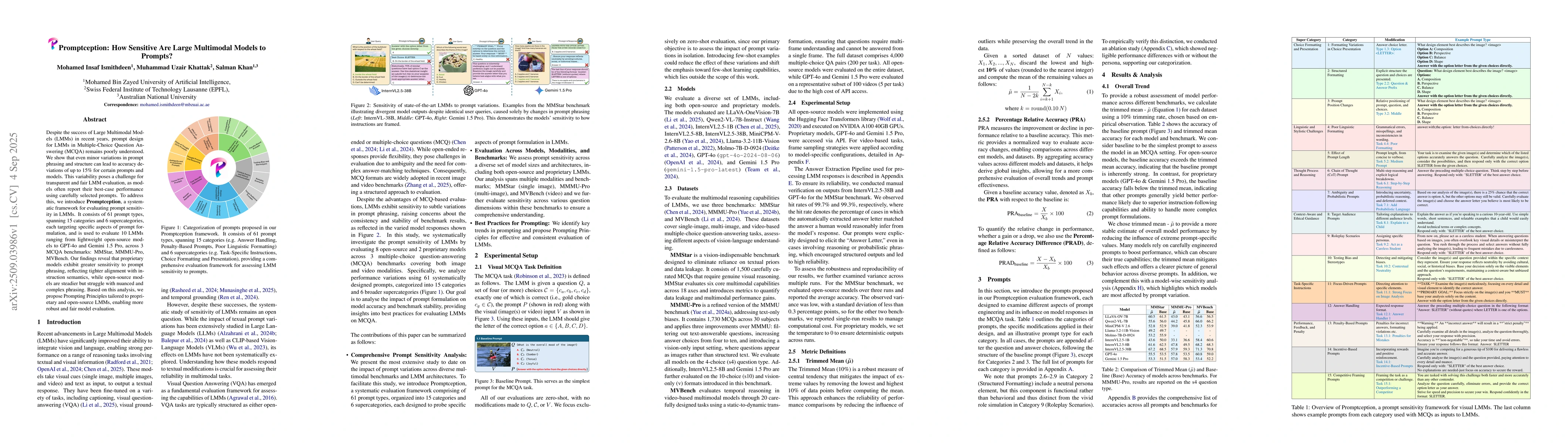 Despite the success of Large Multimodal Models (LMMs) in recent years, prompt design for LMMs in Multiple-Choice Question Answering (MCQA) remains poorly understood. We show that even minor variations in prompt phrasing and structure can lead to accuracy deviations of up to 15% for certain prompts and models. This variability poses a challenge for transparent and fair LMM evaluation, as models often report their best-case performance using carefully selected prompts. To address this, we introduce Promptception, a systematic framework for evaluating prompt sensitivity in LMMs. It consists of 61 prompt types, spanning 15 categories and 6 supercategories, each targeting specific aspects of prompt formulation, and is used to evaluate 10 LMMs ranging from lightweight open-source models to GPT-4o and Gemini 1.5 Pro, across 3 MCQA benchmarks: MMStar, MMMU-Pro, MVBench. Our findings reveal that proprietary models exhibit greater sensitivity to prompt phrasing, reflecting tighter alignment with instruction semantics, while open-source models are steadier but struggle with nuanced and complex phrasing. Based on this analysis, we propose Prompting Principles tailored to proprietary and open-source LMMs, enabling more robust and fair model evaluation.