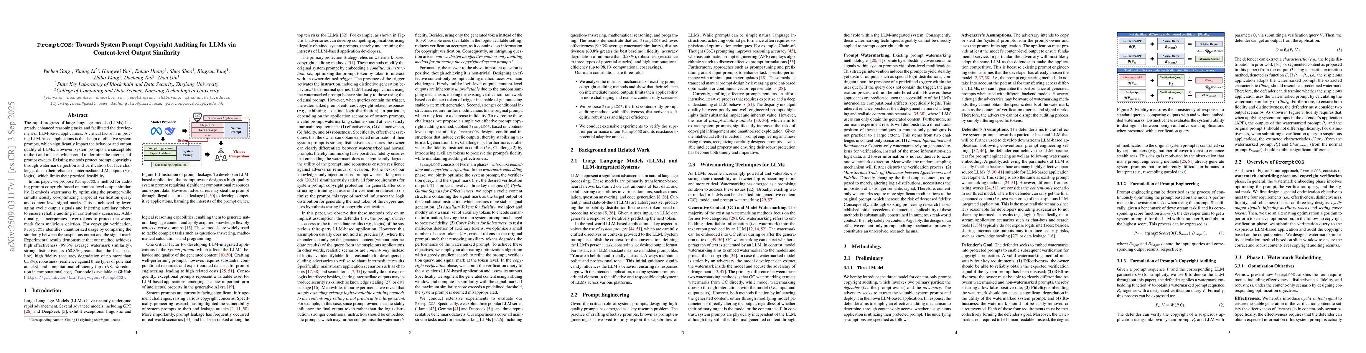 The rapid progress of large language models (LLMs) has greatly enhanced reasoning tasks and facilitated the development of LLM-based applications. A critical factor in improving LLM-based applications is the design of effective system prompts, which significantly impact the behavior and output quality of LLMs. However, system prompts are susceptible to theft and misuse, which could undermine the interests of prompt owners. Existing methods protect prompt copyrights through watermark injection and verification but face challenges due to their reliance on intermediate LLM outputs (e.g., logits), which limits their practical feasibility. In this paper, we propose PromptCOS, a method for auditing prompt copyright based on content-level output similarity. It embeds watermarks by optimizing the prompt while simultaneously co-optimizing a special verification query and content-level signal marks. This is achieved by leveraging cyclic output signals and injecting auxiliary tokens to ensure reliable auditing in content-only scenarios. Additionally, it incorporates cover tokens to protect the watermark from malicious deletion. For copyright verification, PromptCOS identifies unauthorized usage by comparing the similarity between the suspicious output and the signal mark. Experimental results demonstrate that our method achieves high effectiveness (99.3% average watermark similarity), strong distinctiveness (60.8% greater than the best baseline), high fidelity (accuracy degradation of no more than 0.58%), robustness (resilience against three types of potential attacks), and computational efficiency (up to 98.1% reduction in computational cost). Our code is available at GitHub https://github.com/LianPing-cyber/PromptCOS.