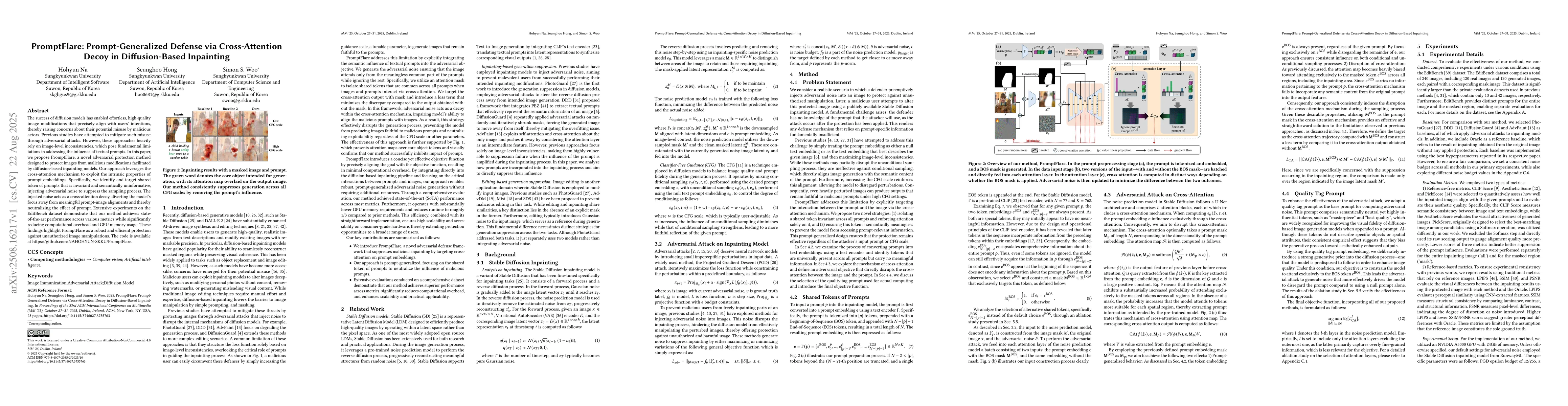 The success of diffusion models has enabled effortless, high-quality image modifications that precisely align with users' intentions, thereby raising concerns about their potential misuse by malicious actors. Previous studies have attempted to mitigate such misuse through adversarial attacks. However, these approaches heavily rely on image-level inconsistencies, which pose fundamental limitations in addressing the influence of textual prompts. In this paper, we propose PromptFlare, a novel adversarial protection method designed to protect images from malicious modifications facilitated by diffusion-based inpainting models. Our approach leverages the cross-attention mechanism to exploit the intrinsic properties of prompt embeddings. Specifically, we identify and target shared token of prompts that is invariant and semantically uninformative, injecting adversarial noise to suppress the sampling process. The injected noise acts as a cross-attention decoy, diverting the model's focus away from meaningful prompt-image alignments and thereby neutralizing the effect of prompt. Extensive experiments on the EditBench dataset demonstrate that our method achieves state-of-the-art performance across various metrics while significantly reducing computational overhead and GPU memory usage. These findings highlight PromptFlare as a robust and efficient protection against unauthorized image manipulations. The code is available at https://github.com/NAHOHYUN-SKKU/PromptFlare.