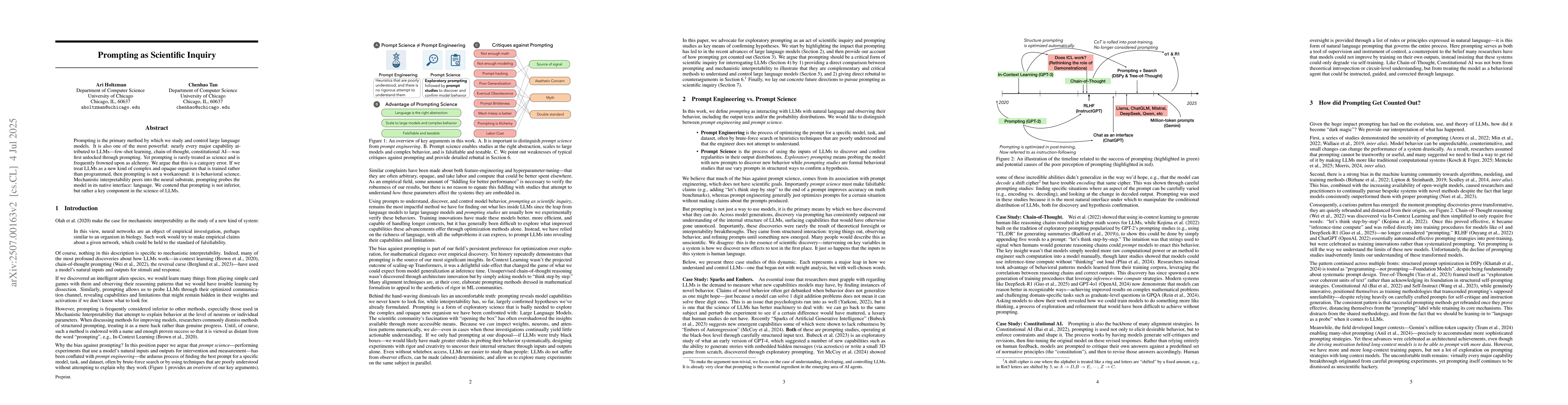 The paper argues that prompting in large language models should be viewed as a scientific method rather than alchemy. It emphasizes prompting's role in unlocking LLM capabilities, comparing it to mechanistic interpretability that studies neural substrates, but in the model's native language interface.