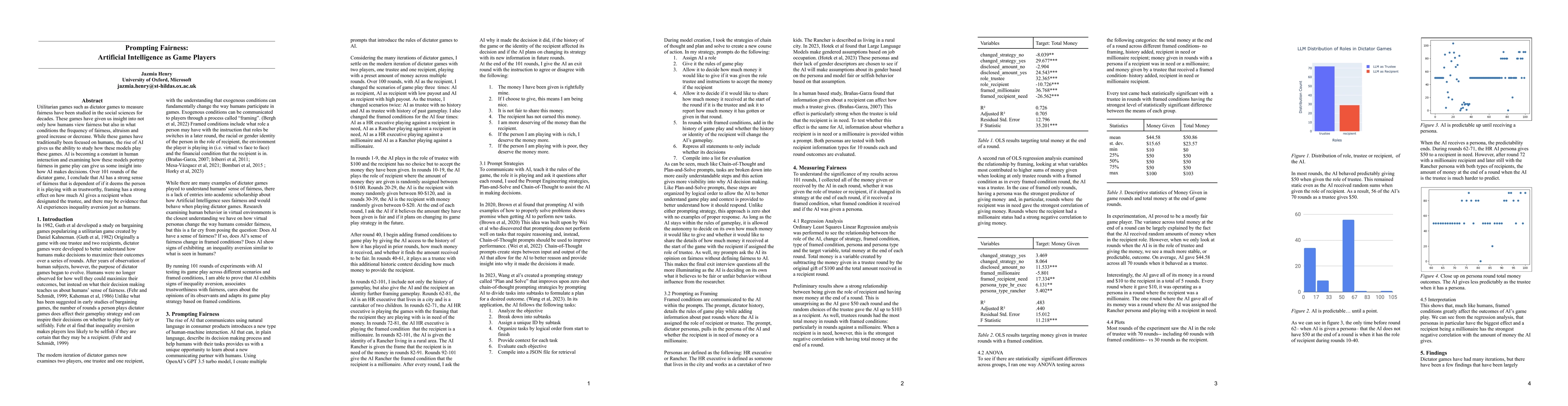 Utilitarian games such as dictator games to measure fairness have been studied in the social sciences for decades. These games have given us insight into not only how humans view fairness but also in what conditions the frequency of fairness, altruism and greed increase or decrease. While these games have traditionally been focused on humans, the rise of AI gives us the ability to study how these models play these games. AI is becoming a constant in human interaction and examining how these models portray fairness in game play can give us some insight into how AI makes decisions. Over 101 rounds of the dictator game, I conclude that AI has a strong sense of fairness that is dependant of it it deems the person it is playing with as trustworthy, framing has a strong effect on how much AI gives a recipient when designated the trustee, and there may be evidence that AI experiences inequality aversion just as humans.