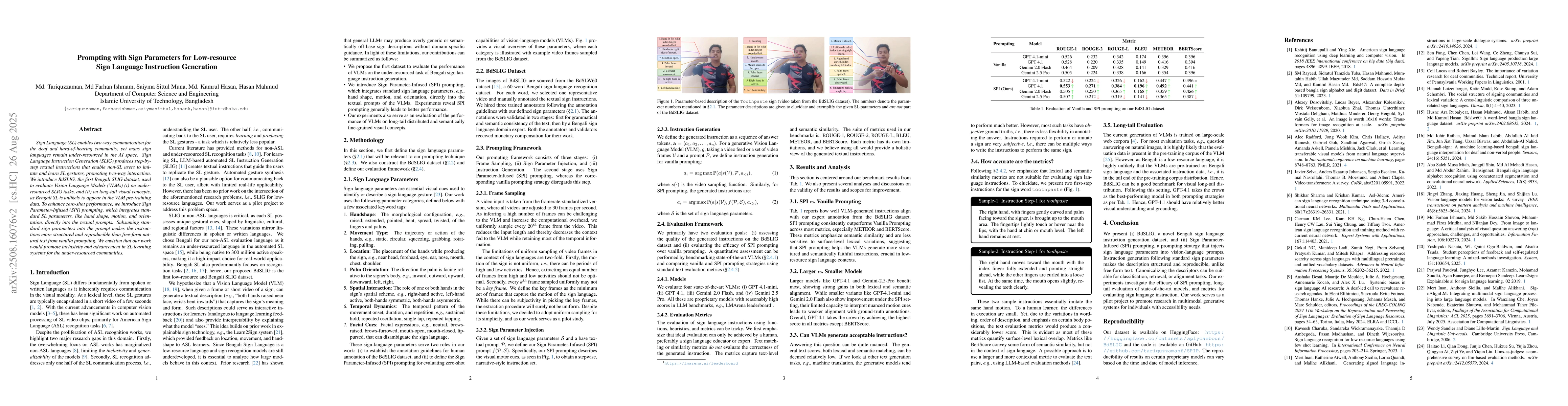 Sign Language (SL) enables two-way communication for the deaf and hard-of-hearing community, yet many sign languages remain under-resourced in the AI space. Sign Language Instruction Generation (SLIG) produces step-by-step textual instructions that enable non-SL users to imitate and learn SL gestures, promoting two-way interaction. We introduce BdSLIG, the first Bengali SLIG dataset, used to evaluate Vision Language Models (VLMs) (i) on under-resourced SLIG tasks, and (ii) on long-tail visual concepts, as Bengali SL is unlikely to appear in the VLM pre-training data. To enhance zero-shot performance, we introduce Sign Parameter-Infused (SPI) prompting, which integrates standard SL parameters, like hand shape, motion, and orientation, directly into the textual prompts. Subsuming standard sign parameters into the prompt makes the instructions more structured and reproducible than free-form natural text from vanilla prompting. We envision that our work would promote inclusivity and advancement in SL learning systems for the under-resourced communities.