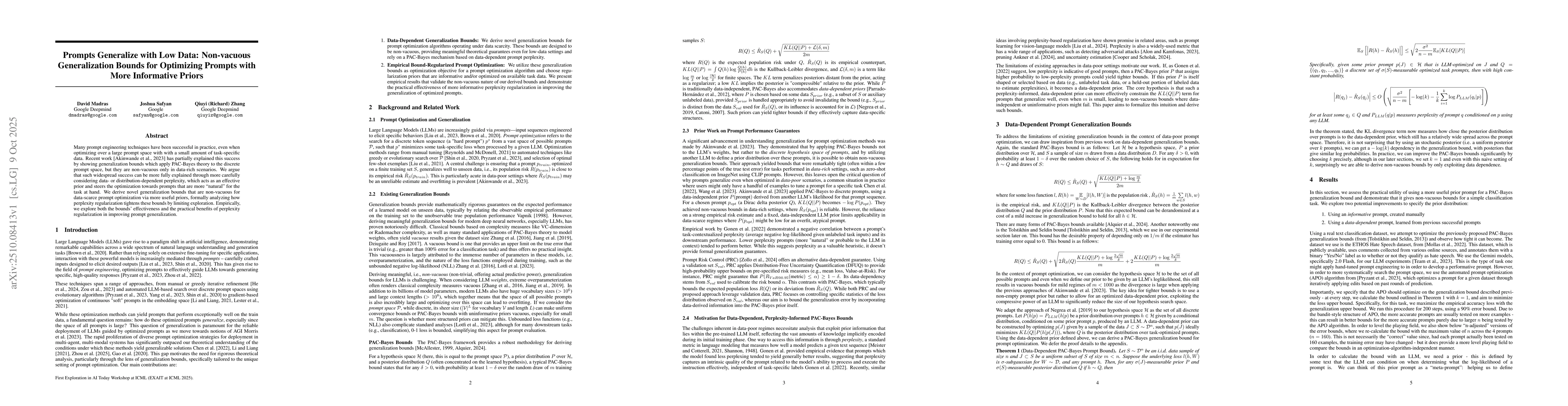 This work introduces a data-dependent perplexity-informed prior for prompt optimization, combining PAC-Bayes theory with practical prompt engineering techniques to achieve meaningful generalization guarantees, which is a departure from previous methods that relied on data-independent priors.