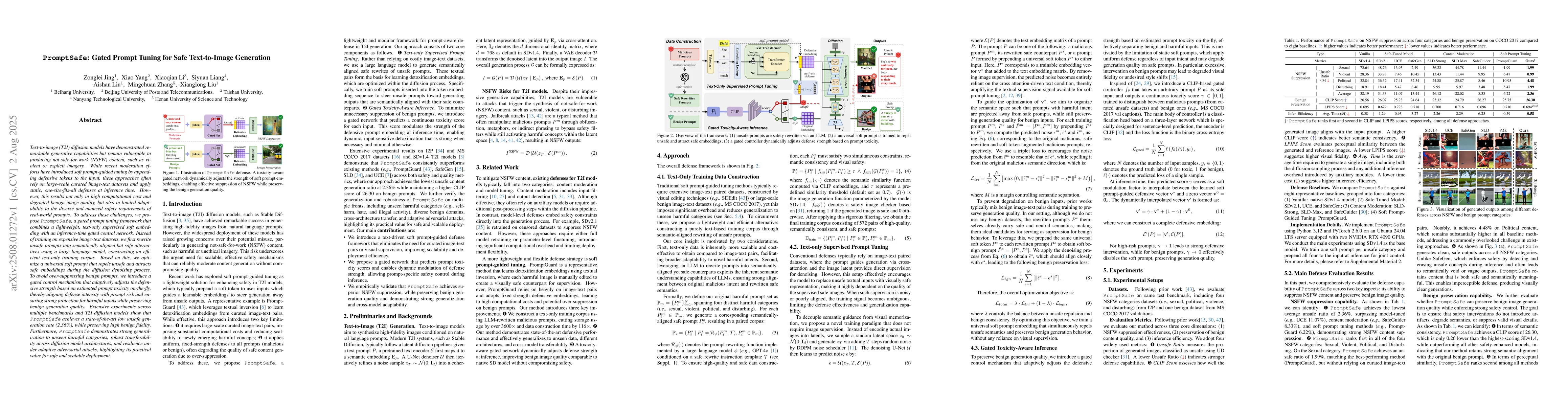 Text-to-image (T2I) models have demonstrated remarkable generative capabilities but remain vulnerable to producing not-safe-for-work (NSFW) content, such as violent or explicit imagery. While recent moderation efforts have introduced soft prompt-guided tuning by appending defensive tokens to the input, these approaches often rely on large-scale curated image-text datasets and apply static, one-size-fits-all defenses at inference time. However, this results not only in high computational cost and degraded benign image quality, but also in limited adaptability to the diverse and nuanced safety requirements of real-world prompts. To address these challenges, we propose PromptSafe, a gated prompt tuning framework that combines a lightweight, text-only supervised soft embedding with an inference-time gated control network. Instead of training on expensive image-text datasets, we first rewrite unsafe prompts into semantically aligned but safe alternatives using an LLM, constructing an efficient text-only training corpus. Based on this, we optimize a universal soft prompt that repels unsafe and attracts safe embeddings during the diffusion denoising process. To avoid over-suppressing benign prompts, we introduce a gated mechanism that adaptively adjusts the defensive strength based on estimated prompt toxicity, thereby aligning defense intensity with prompt risk and ensuring strong protection for harmful inputs while preserving benign generation quality. Extensive experiments across multiple benchmarks and T2I models show that PromptSafe achieves a SOTA unsafe generation rate (2.36%), while preserving high benign fidelity. Furthermore, PromptSafe demonstrates strong generalization to unseen harmful categories, robust transferability across diffusion model architectures, and resilience under adaptive adversarial attacks, highlighting its practical value for safe and scalable deployment.
