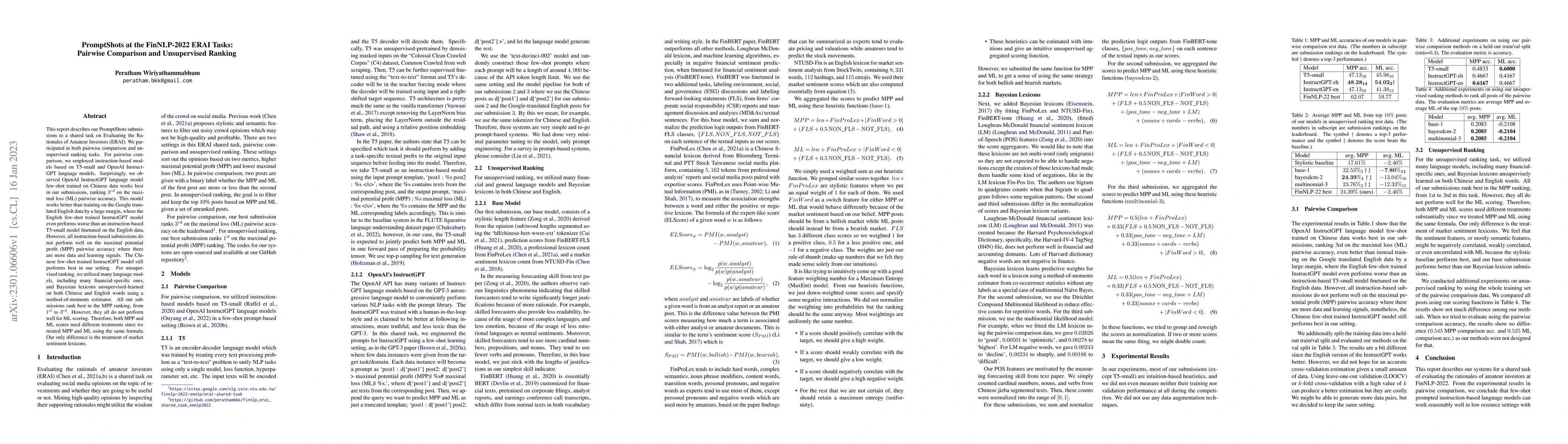 This report describes our PromptShots submissions to a shared task on Evaluating the Rationales of Amateur Investors (ERAI). We participated in both pairwise comparison and unsupervised ranking tasks. For pairwise comparison, we employed instruction-based models based on T5-small and OpenAI InstructGPT language models. Surprisingly, we observed OpenAI InstructGPT language model few-shot trained on Chinese data works best in our submissions, ranking 3rd on the maximal loss (ML) pairwise accuracy. This model works better than training on the Google translated English data by a large margin, where the English few-shot trained InstructGPT model even performs worse than an instruction-based T5-small model finetuned on the English data. However, all instruction-based submissions do not perform well on the maximal potential profit (MPP) pairwise accuracy where there are more data and learning signals. The Chinese few-shot trained InstructGPT model still performs best in our setting. For unsupervised ranking, we utilized many language models, including many financial-specific ones, and Bayesian lexicons unsupervised-learned on both Chinese and English words using a method-of-moments estimator. All our submissions rank best in the MPP ranking, from 1st to 3rd. However, they all do not perform well for ML scoring. Therefore, both MPP and ML scores need different treatments since we treated MPP and ML using the same formula. Our only difference is the treatment of market sentiment lexicons.
