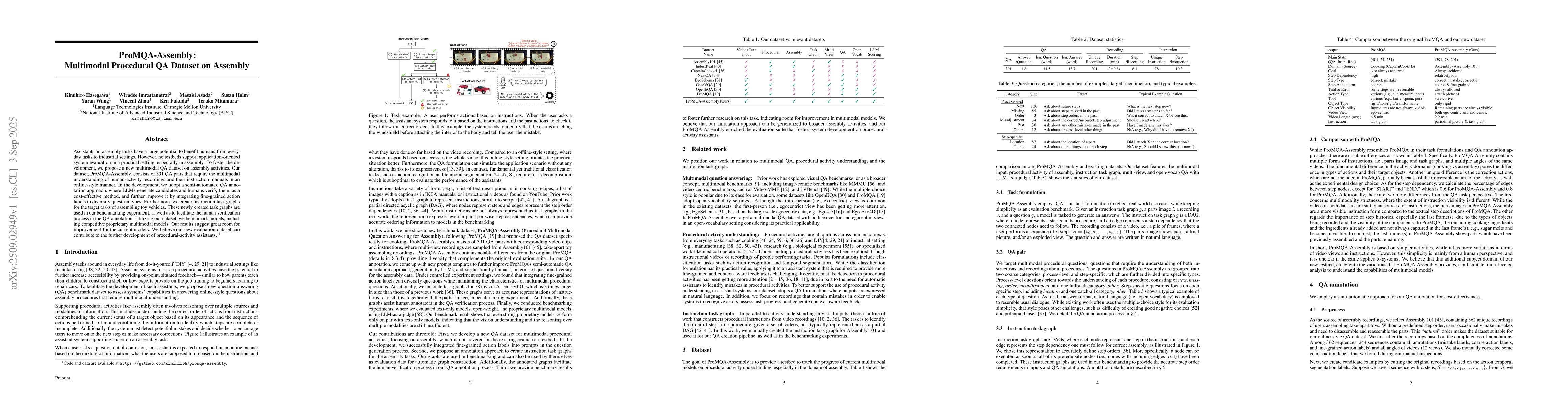 Assistants on assembly tasks have a large potential to benefit humans from everyday tasks to industrial settings. However, no testbeds support application-oriented system evaluation in a practical setting, especially in assembly. To foster the development, we propose a new multimodal QA dataset on assembly activities. Our dataset, ProMQA-Assembly, consists of 391 QA pairs that require the multimodal understanding of human-activity recordings and their instruction manuals in an online-style manner. In the development, we adopt a semi-automated QA annotation approach, where LLMs generate candidates and humans verify them, as a cost-effective method, and further improve it by integrating fine-grained action labels to diversify question types. Furthermore, we create instruction task graphs for the target tasks of assembling toy vehicles. These newly created task graphs are used in our benchmarking experiment, as well as to facilitate the human verification process in the QA annotation. Utilizing our dataset, we benchmark models, including competitive proprietary multimodal models. Our results suggest great room for improvement for the current models. We believe our new evaluation dataset can contribute to the further development of procedural-activity assistants.