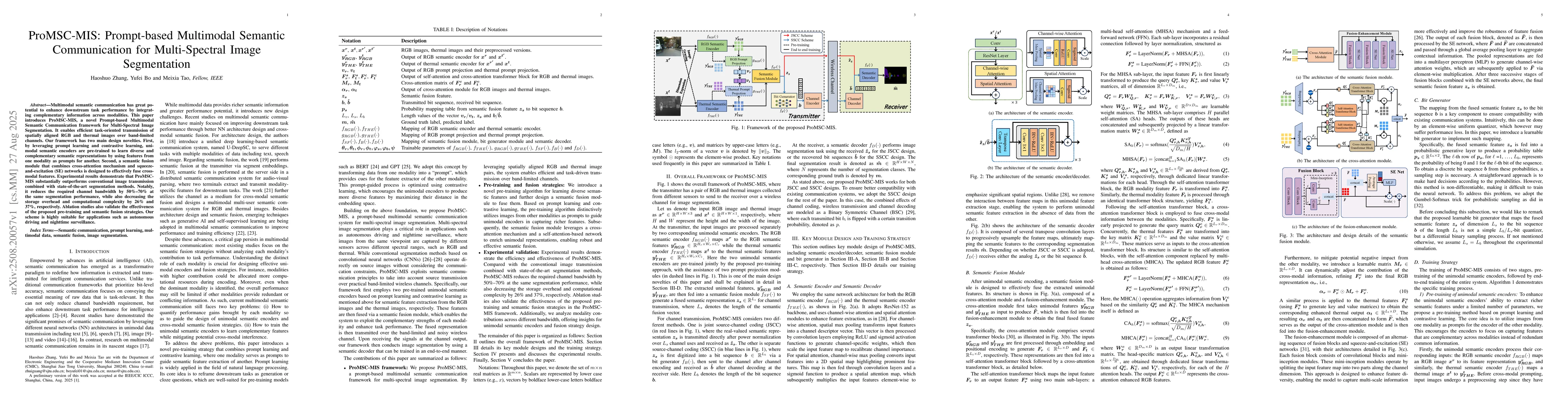Multimodal semantic communication has great potential to enhance downstream task performance by integrating complementary information across modalities. This paper introduces ProMSC-MIS, a novel Prompt-based Multimodal Semantic Communication framework for Multi-Spectral Image Segmentation. It enables efficient task-oriented transmission of spatially aligned RGB and thermal images over band-limited channels. Our framework has two main design novelties. First, by leveraging prompt learning and contrastive learning, unimodal semantic encoders are pre-trained to learn diverse and complementary semantic representations by using features from one modality as prompts for another. Second, a semantic fusion module that combines cross-attention mechanism and squeeze-and-excitation (SE) networks is designed to effectively fuse cross-modal features. Experimental results demonstrate that ProMSC-MIS substantially outperforms conventional image transmission combined with state-of-the-art segmentation methods. Notably, it reduces the required channel bandwidth by 50%--70% at the same segmentation performance, while also decreasing the storage overhead and computational complexity by 26% and 37%, respectively. Ablation studies also validate the effectiveness of the proposed pre-training and semantic fusion strategies. Our scheme is highly suitable for applications such as autonomous driving and nighttime surveillance.