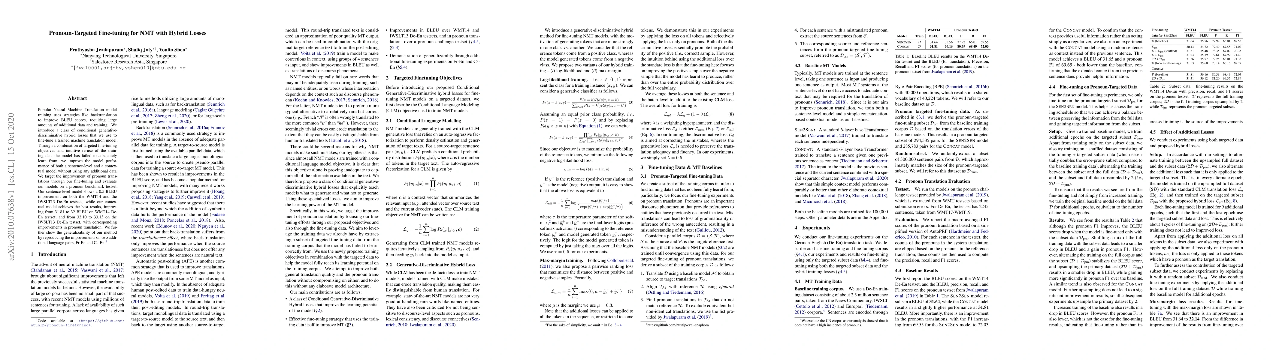 A new fine-tuning method improves NMT model performance on pronoun translations without additional data, achieving 0.5 BLEU improvements in sentence-level models and surpassing previous results in contextual models.