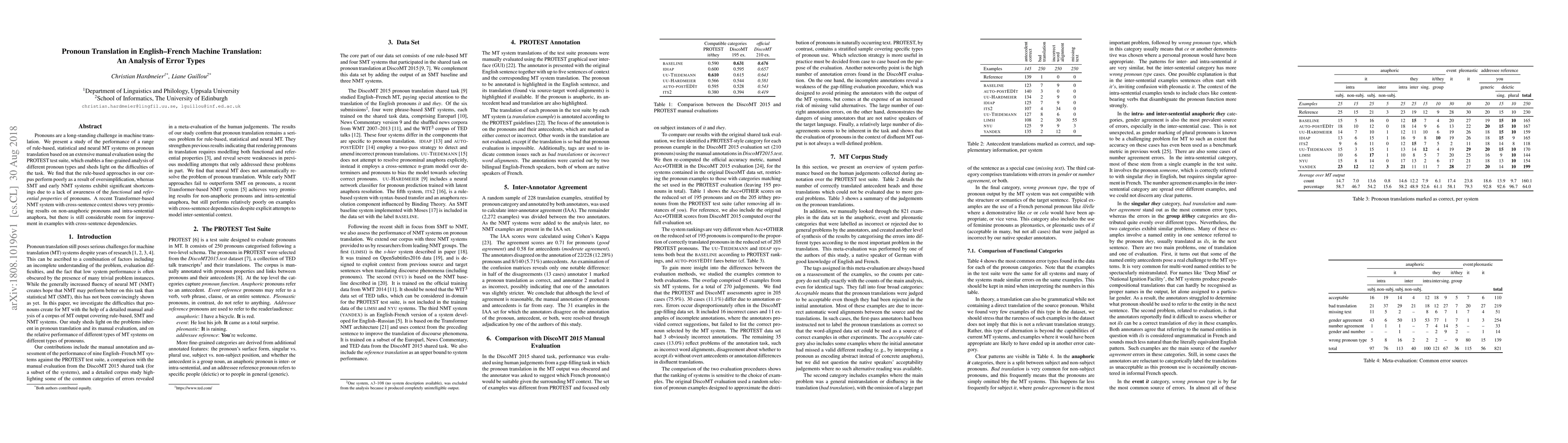 This study evaluates various machine translation systems' performance on pronoun translation, revealing that rule-based methods struggle with oversimplification, while statistical and early neural methods lack awareness of pronoun properties. A recent Transformer-based neural model shows promising results for certain pronoun types but still needs improvement for cross-sentence dependencies.