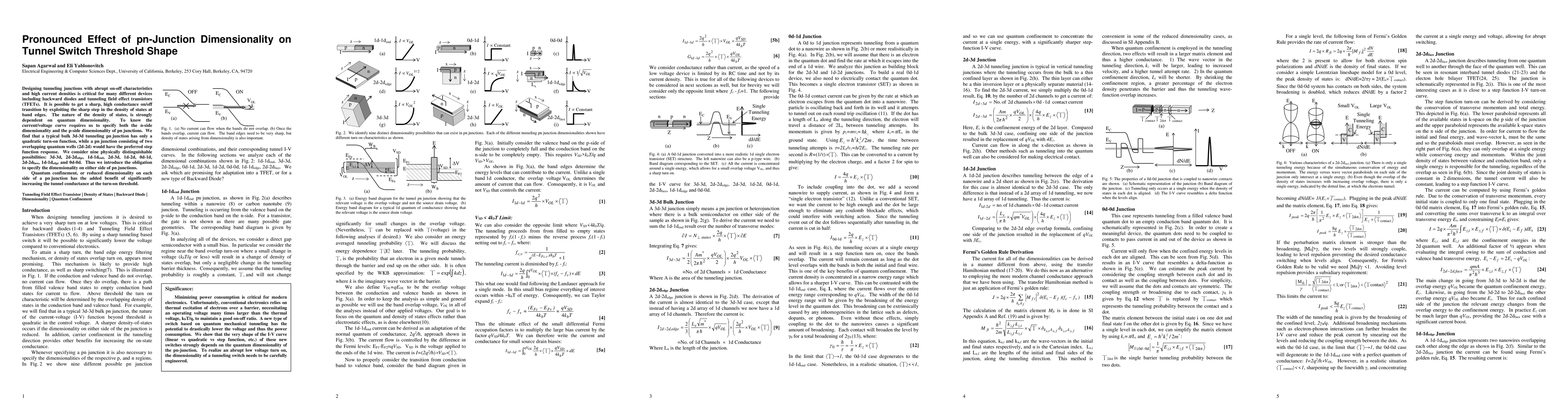 This paper investigates the impact of pn-junction dimensionality on the shape of the tunnel switch's threshold, finding that quantum confinement significantly enhances tunnel conductance. It concludes that 2d-2d junctions exhibit the desired sharp on/off transition, unlike bulk 3d-3d junctions.