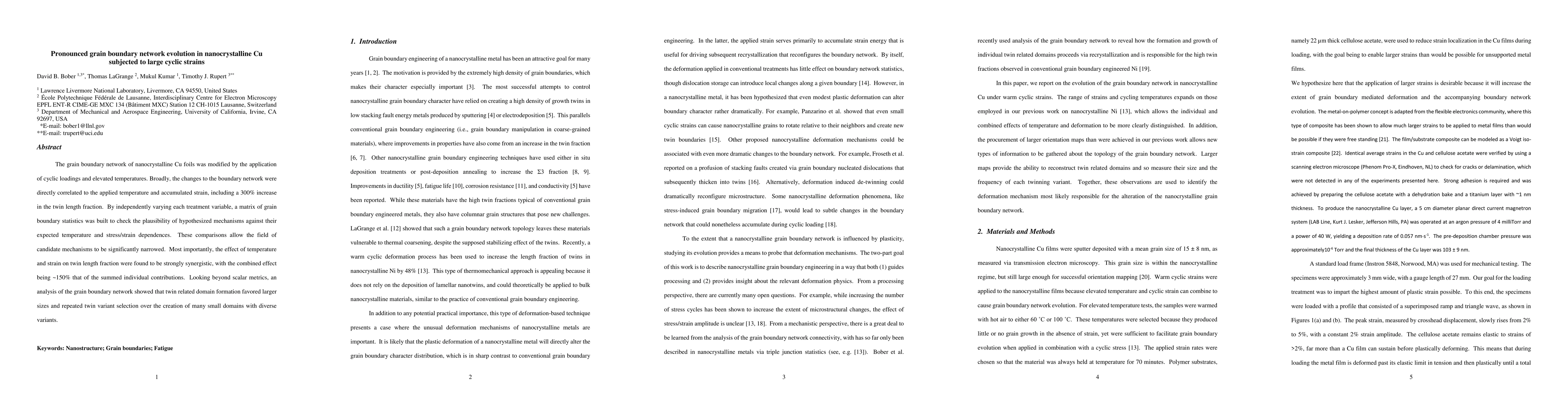 This study investigates the evolution of grain boundary networks in nanocrystalline Cu foils under cyclic strains and elevated temperatures, revealing a synergistic effect that increases twin length by 300%. The findings suggest that shear-coupled boundary migration twinning is the primary mechanism for grain boundary engineering.