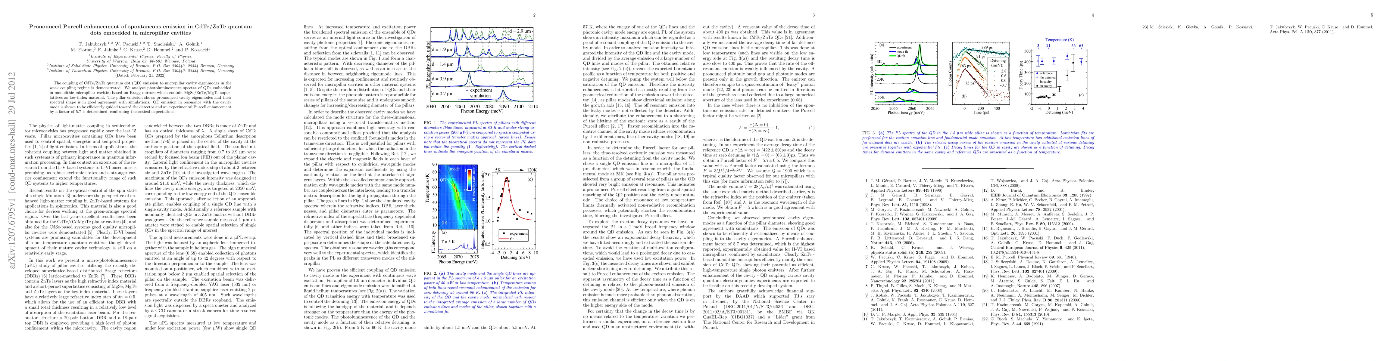 This study demonstrates pronounced Purcell enhancement of spontaneous emission in CdTe/ZnTe quantum dots embedded in micropillar cavities, achieving a factor of 5.7, confirmed by good agreement between experimental photoluminescence spectra and simulations.